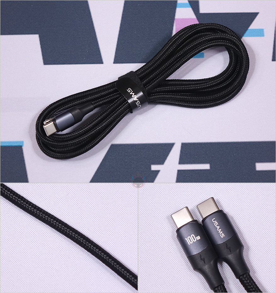 끝으로, 제공되는 USB 충전케이블은 자사의 U71이라는 충전과 데이터 모두 가능한 케이블로 총 2m 길이에 충전케이블로 사용할 때는 최대 100W까지 지원하며, 데이터 케이블(Data cable)로 사용할 때는 480Mbps까지 지원합니다. 그리고, 케이블은 꼬임방지를 위해 전체 슬리빙처리가 되어있으면, USB 인터페이스는 Type-C to C입니다.