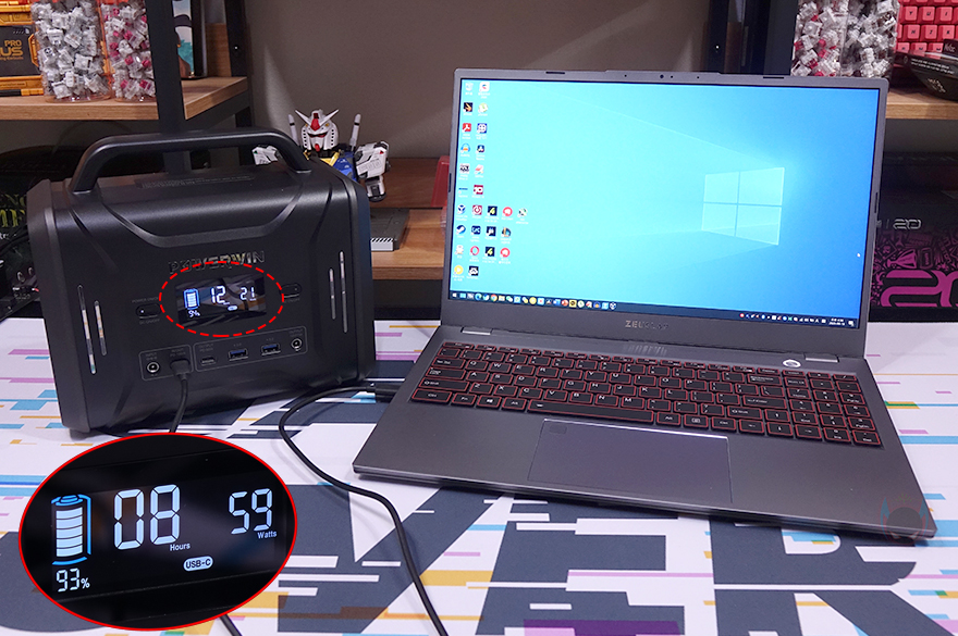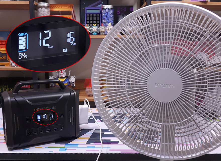 앞서 잠깐 언급했지만, PPS320 파워뱅크의 배터리용량은 320Wh입니다. mAh로는 100,000mAh죠. 이는 이름 좀 알려진 에코플로우(Ecoflow), 블루티(Bluetti), Allpowers, Shell, Flashfish 등 경쟁사 동급 제품들과 비교 동틀어서도 가장 많은 용량입니다. 쉽게 말해, 일반적으로 현재 300W 파워뱅크 제품들은 268~296Wh으로 300Wh 넘는 제품이 없고, 유일하게 PPS320만 300Wh를 넘기고 있다는 말입니다. 그래서, 다른 경쟁사들보다 훨씬 오래 사용합니다. 실제로 전자 제품들을 연결해서 사용할 수 있는 시간을 확인해 보면, 65W PD 지원의 노트북(Laptop) 같은 경우는 7~8시간, 24W의 선풍기(Fan) 같은 경우는 10~11시간 정도 사용할 수 있다고 표시를 해주는데, 이건 해당 전자제품의 최대 소비전력일 때 기준이고 최소나 변동되는 전자 제품에 따라선 이보다 더 오래 사용할 수 있습니다. 참고로, 300Wh가 안 되는 파워뱅크 제품들 같은 경우 노트북 최대 사용시간이 3~5시간밖에 안됩니다.