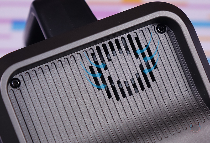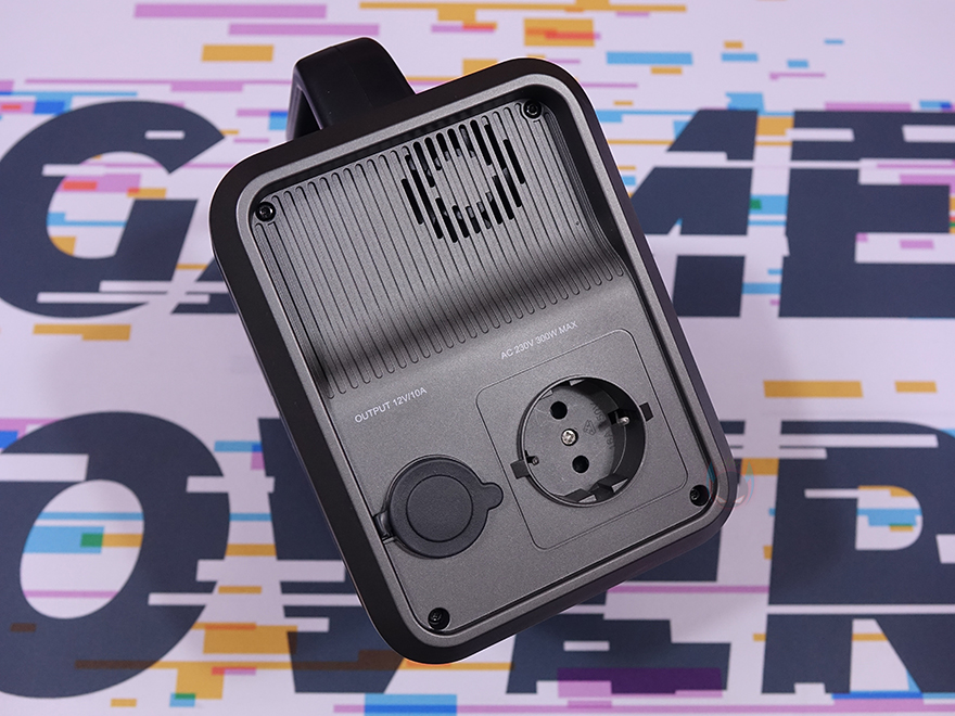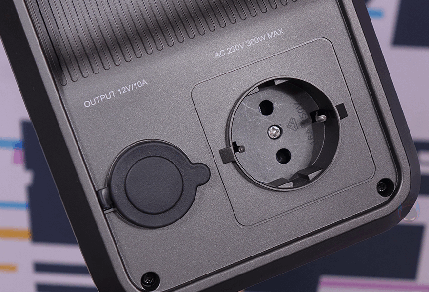 그리고, PPS320 파워뱅크 양쪽 측면 중 한쪽에는 윗부분에 내부 발열 해결을 위한 쿨링(Cooling) 시스템 흡입구가 적용되어 있으며, 아래에는 2개의 출력 포트가 추가로 배치되어 있는데, 하나는 차량용 시거잭과 연결되는 DC 12V, 그리고 나머지 하나는 AC 220V 플러그와 연결되는 콘센트 타입입니다. 또한, 시거잭 DC 12V 포트는 사용하지 않을 시 먼지 유입방지를 위해 전용 덮개(Cover)가 적용되어 있으며, 출력은 112~146W입니다. 그리고, AC 220V 콘센트는 16A/50V로 최대 300W까지 출력합니다.