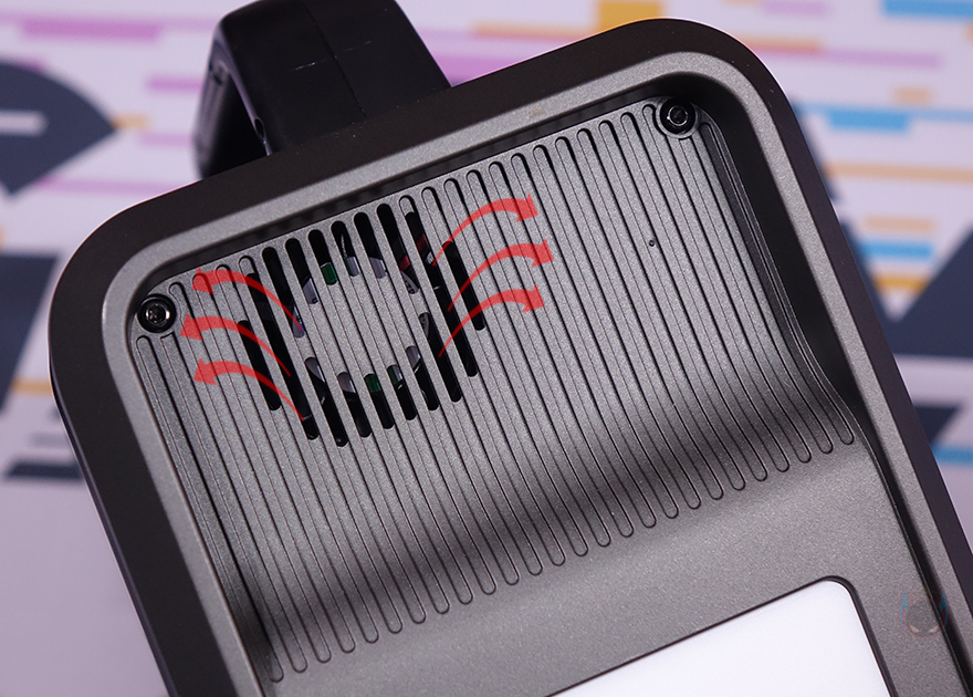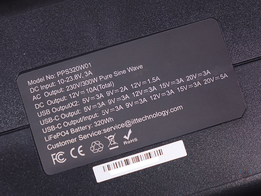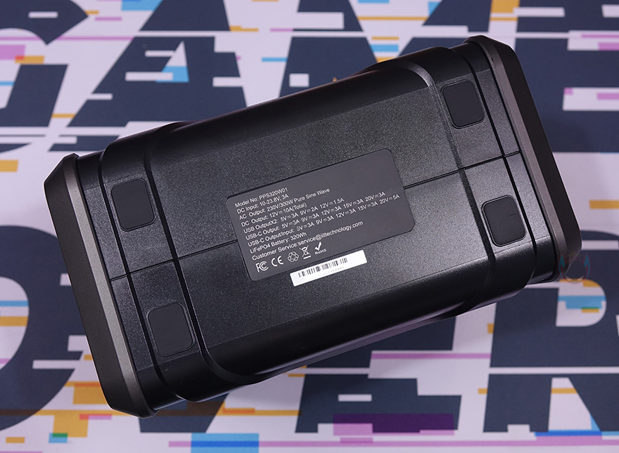 반대쪽 측면에는 역시 윗부분에 내부에 발열이 빠져나갈 수 있게 쿨링 시스템 배기구가 적용되어 있으며, 아래에는 야외 활동시 어두운 곳에서 사용할 수 있게 라이트(Light) 기능을 갖추고 있습니다. 뒤에서 확인하겠지만, 라이트 아래에 배치된 버튼을 누를 때마다 순차적으로 3가지 모드로 전환됩니다. 그리고, 밑바닥 부분에는 미끄럼방지를 위해 모서리 부근에 패드(Pad)를 부착해 놨으며, 가운데는 지금까지 언급한 각 포트의 입출력 정보와 배터리 용량이 표기되어 있습니다. 참고로, PPS320는 320Wh 용량을 가지고 있는데, mAh 용량기준으로 100,000mAh이며, 내장된 배터리는 자동차 배터리로 많이 사용되는 리튬 배터리 중 가장 안전한 리튬인산철(LiFePO4) 배터리가 사용되어 있습니다.
