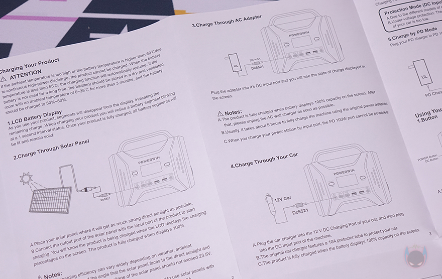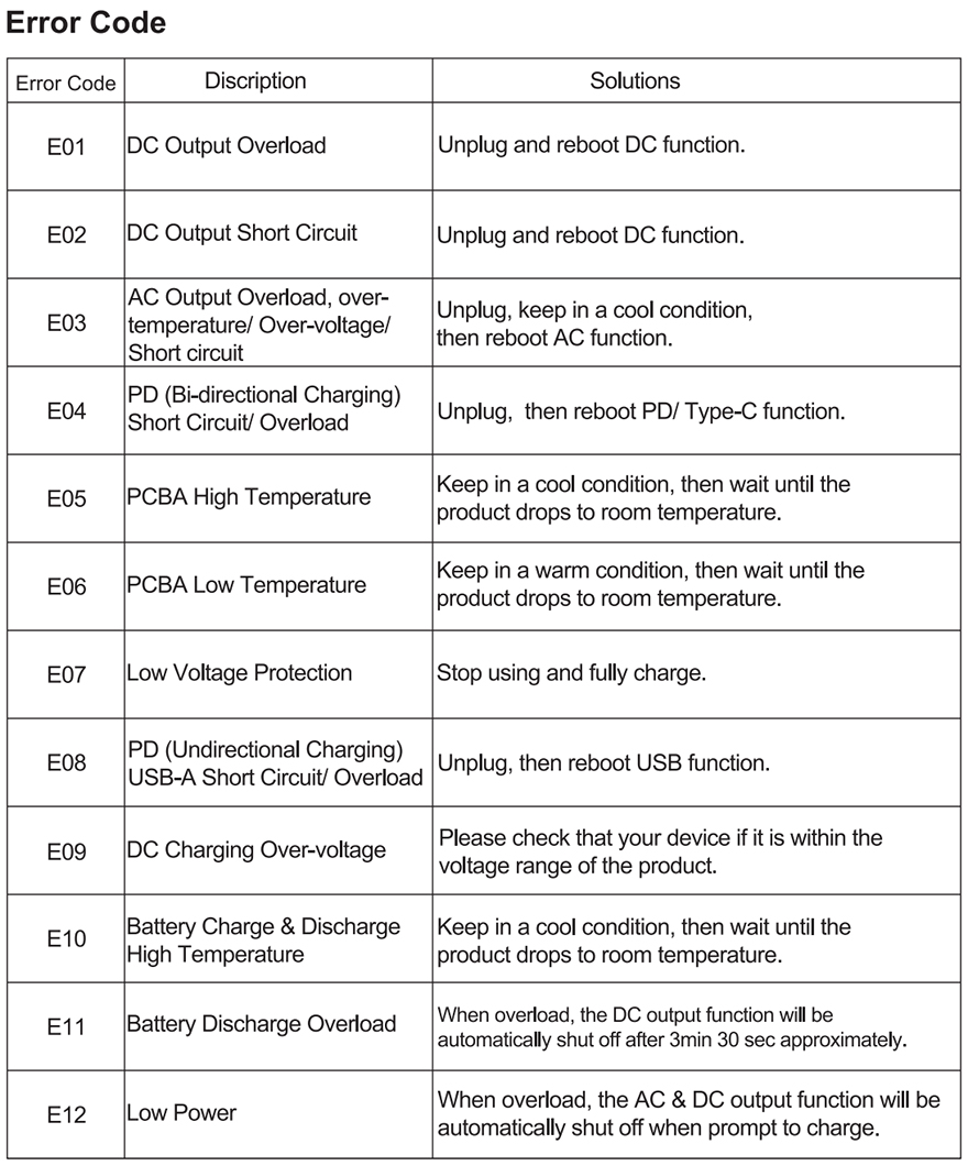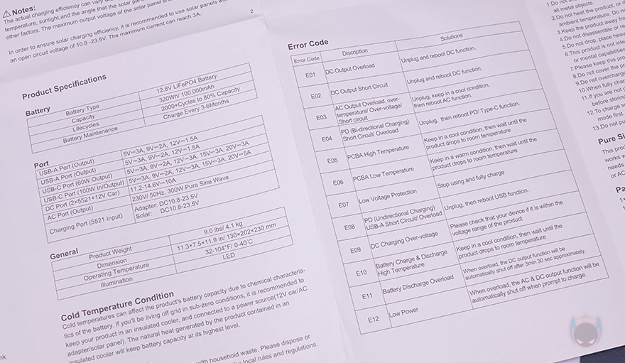 그리고, 무게가 있는만큼 구매 시 이동 편의를 위해 박스 손잡이가 적용되어 있으며, 박스를 열어보면, 구성품 아래에 비닐포장과 외부충격 방지로 우레탄-폼에 포장된 PPS320 파워뱅크를 확인할 수 있습니다. 제품구성은 PPS320 파워뱅크, 제품설명서, AC 충전 어댑터 및 케이블, 자동차 시거잭 충전 케이블, 태양광패널로 충전 시 사용되는 PV to DC 5521 어댑터 케이블, PD 100W USB Type C to C 충전케이블로 이루어져 있습니다. 그리고, 앞서 언급했듯이 제품에 관한 자세한 사양은 설명서에서 확인할 수 있으며, 제품 문제를 알려주는 에러코드(Error code)도 확인할 수 있죠.