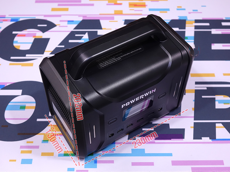 그럼, POWERWIN PPS320 파워뱅크(Power Station)를 살펴보는데, 색상은 양쪽 측면에 메탈 그레이(Metal Gray) 그리고 나머지는 블랙(Black) 색상으로 적용되었으며, 크기는 130x202x230mm으로 작은 편입니다. 흔히 테이블로 올려놓는 블루투스 스피커와 비슷하죠. 무게는 4.1kg 수준으로 묵직하지만, 일반 성인 여성이 운동할 때는 드는 덤벨 무게 수준이라 여성이 들기에도 큰 불편함은 없습니다. 또한, 상단에는 이동시 편의를 위한 손잡이도 있는데, 크기가 작다 보니 성인 남성보다는 성인 여성 손에 좀 더 그립이 편하죠.