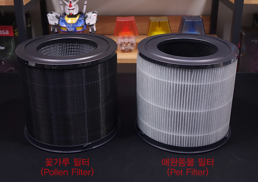 분리된 기본 필터를 살펴보면, 원형 필터로 다른 필터 제품들처럼 바깥쪽에는 망이 적용되어 있습니다. 기본 장착되는 필터는 가루입자(Pollen)를 걸러주는 필터이며, 공기정화율은 250m³/h입니다. 물론, 요즘 애완동물을 키우는 소비자들도 많기 때문에 애완동물 필터(Pet Filter)도 따로 판매하고 있는데, 구매했을 때 비닐로 완전 밀봉 되어있으며, 한눈에 봐도 두 필터의 차이를 구분할 수 있습니다. 특히, 애완동물 필터 같은경우에는 안쪽에 망이 더 촘촘해서 공기정화율이 230m³/h입니다. 참고로, 필터 구분과 상관없이 먼지 공기정화율은 220m³/h, 연기 공기정화율은 200m³/h입니다.
