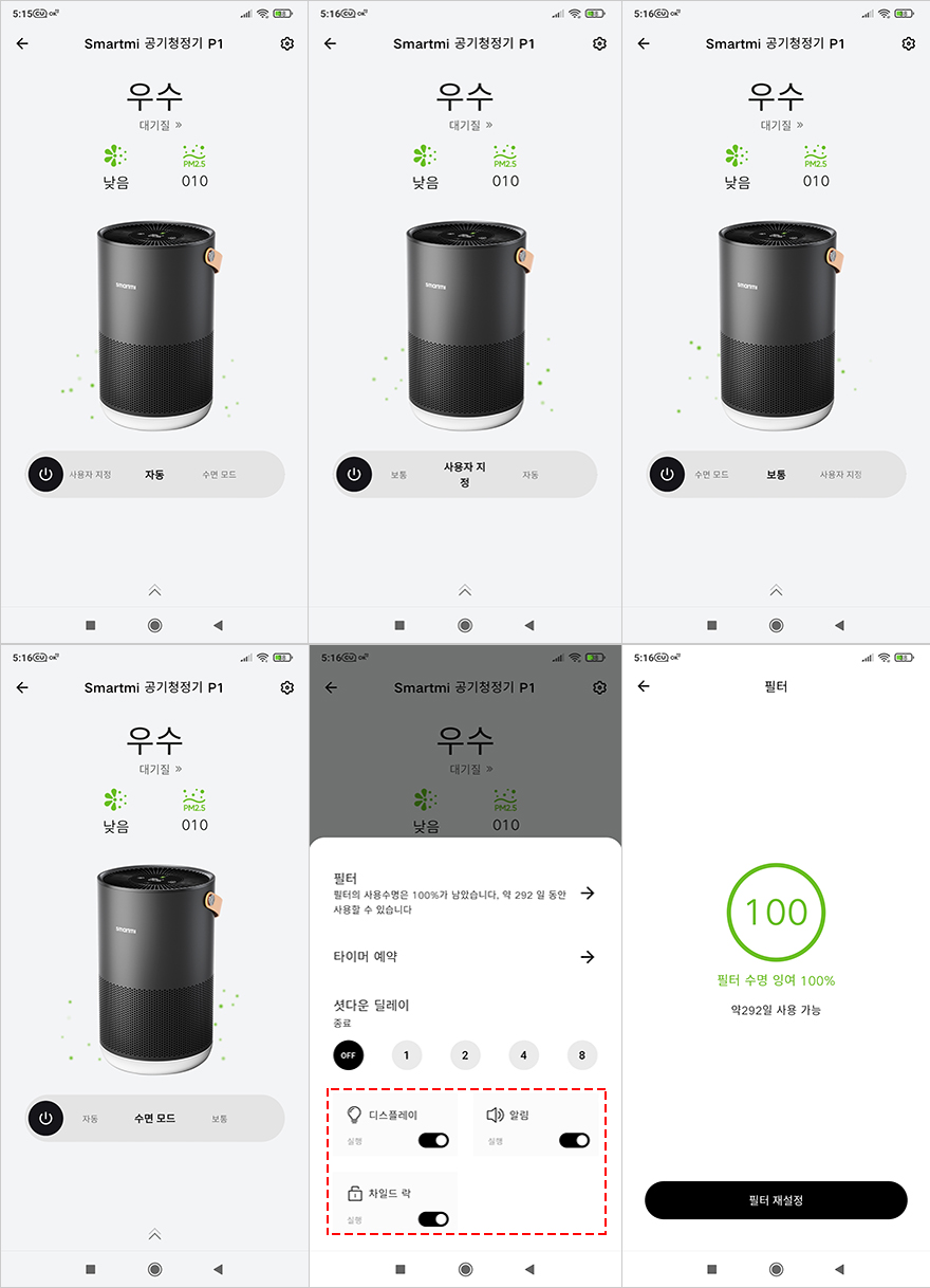 Smartmi Link과 연동이 되면, 어플에선 터치 디스플레이에서 설정할 수 있었던 기능들을 어플에서도 모두 동일하게 다룰 수 있으며, 추가로 어플에선 디스플레이 On/Off, 터치할 때마다 발생하는 비프음 알림 On/Off, 그리고 아이가 만지는 것을 보호해 주는 보호기능 On/Off를 추가로 설정할 수 있습니다. 참고로, 아이 보호 기능을 켜면, 어플로만 전원 On/Off 할 수 있습니다. 또한, 어플에선 사용 중인 필터의 상태도 확인할 수 있고, 대기질도 일/주/월 단위로 기록해 줍니다. 끝으로, 다른 공기청정기 제품들처럼 P1 공기청정기 역시 벽에 붙여두고 사용하는 것보다 약 20cm 거리를 두고 사용하는 것이 효율적입니다.