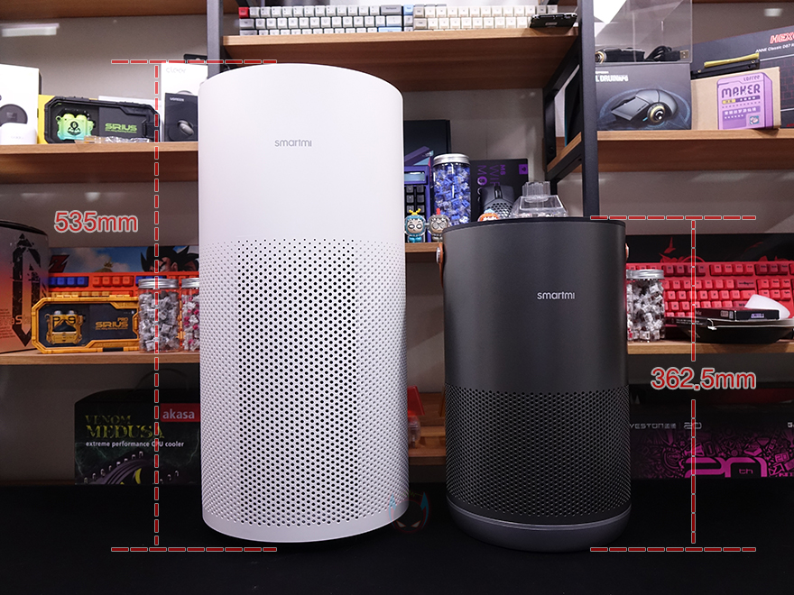 그럼, 본격적으로 스마트미(Smartmi) P1 공기청정기(Air Purifier)를 살펴보는데, 제품 색상은 블랙(Black)과 실버(Silver) 2가지 색상으로 나왔습니다. 그리고, P1 공기청정기 디자인 베이스는 먼저 나왔던 거실용 공기청정기(https://piscomu.com/4233) 모델과 비슷한 원통형 디자인으로 둘을 비교해보면, 확실히 높이 사이즈가 작아진 것을 확인할 수 있죠. 물론, 원통 지름도 P1이 40mm 정도 작습니다. 그래서, 앞서 언급했듯이 한눈에 봐도 거실용보다는 방 한 칸에 하나씩 놓고 사용하기 딱 맞는 소형 공기청정기라고 이야기했죠.