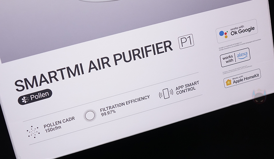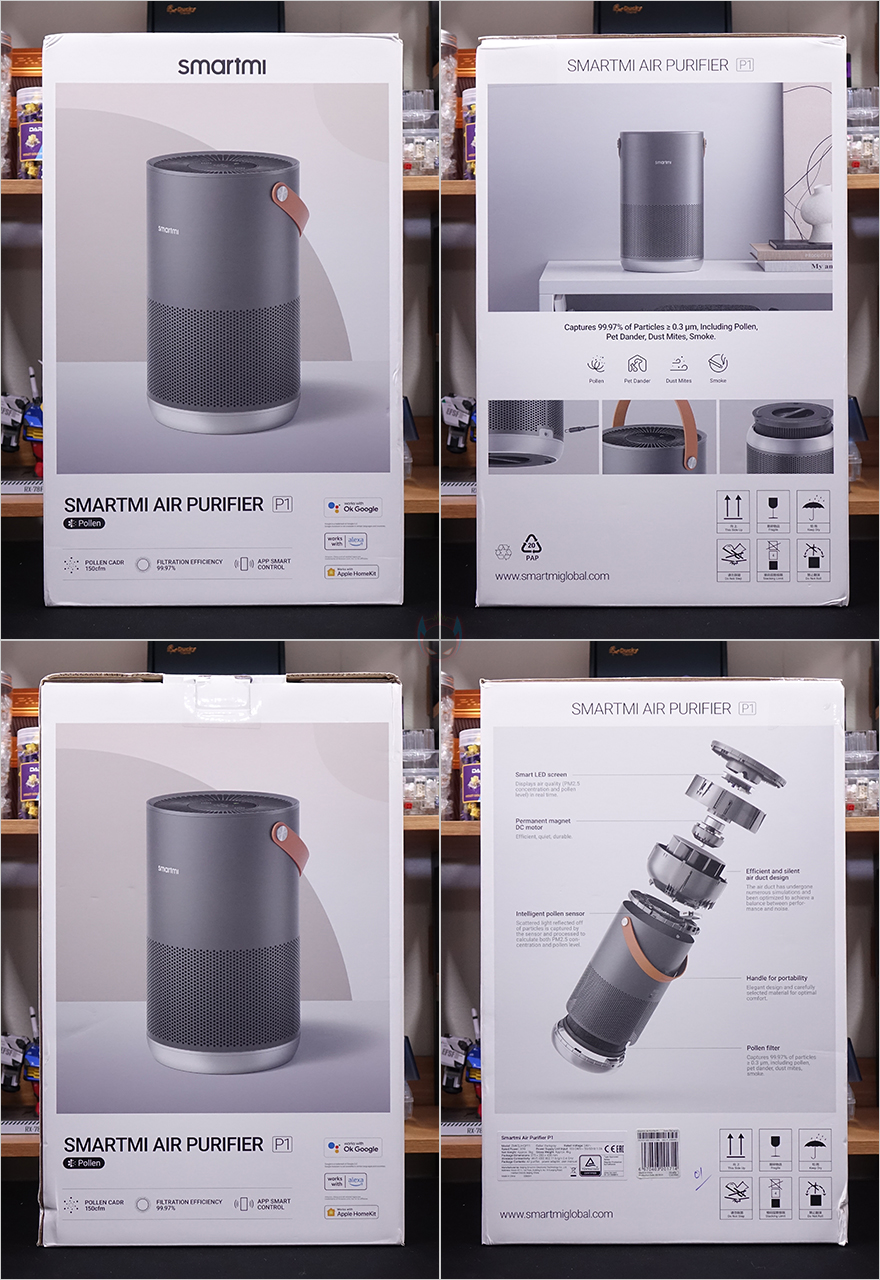 제품 패키지는 박스형태로 소형 공기청정기 제품답게 박스가 큰 편은 아닙니다. 쉽게 말해, 거실용 공기청정기보다는 작은 규모라는거죠. 박스 전후면에는 제품 이미지를 담고 있는데, 한눈에 봐도 거실보다는 방에 놓고 사용하는 소형 가전이라는 걸 짐작할 수 있습니다. 그리고, 시작에서도 잠깐 언급했듯이 스마트미 제품들이 출시한 지 좀 되어도 꾸준히 인기를 받는 건 어플 연동이 완벽하기 때문인데, P1 공기청정기 역시 모델명 옆에 구글(Google)/아마존(Amazon)/애플(Apple) 연동 지원이 표기되어 있죠. 물론, 자체 어플도 지원하고 있습니다.