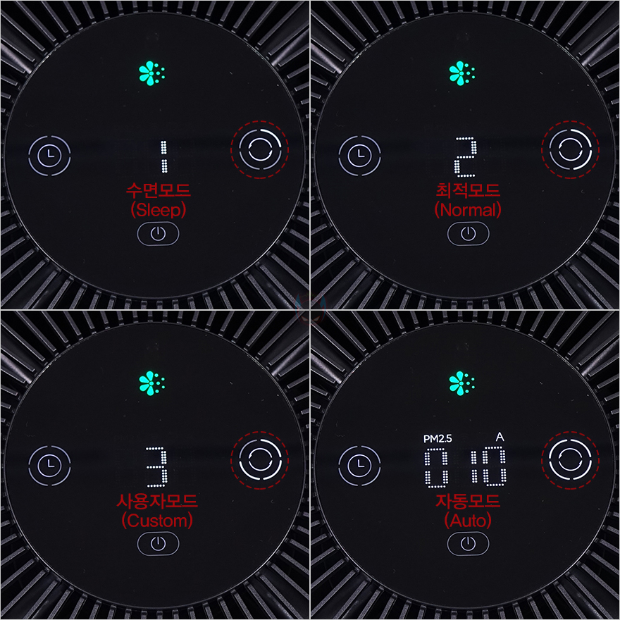 직접, 스마트미(Smartmi) P1 공기청정기를 사용해 보면, 앞서 디자인 부분에서 잠깐 확인했지만 먼저 나왔던 거실용 공기청정기 모델과 디자인이 비슷하기 때문에, 조작법도 비슷합니다. 상단에 위치한 터치방식의 디스플레이에서 모든 기능을 다룰 수 있죠. 전원 표시를 터치하면 전원 On/Off를 할 수 있으며, 화면이 켜지면 정가운데에 기본 화면으로 PM2.5 단계를 보여주고, 화면 맨 위에는 공기오염상태, 숫자 왼쪽에는 타이머(Timer), 숫자 오른쪽에는 모드(Mode) 터치 버튼이 배치되어 있습니다. 모드는 한 번씩 터치할 때마다 수면모드(Sleep)→최적모드(Normal)→사용자모드(Custom)→자동모드(Auto)순으로 전환되며, 사용자모드는 어플에서 설정을 다룰 수 있습니다. 그리고, 타이머 역시 한 번씩 터치할때마다 1시간→2시간→4시간→8시간→Off로 설정됩니다.