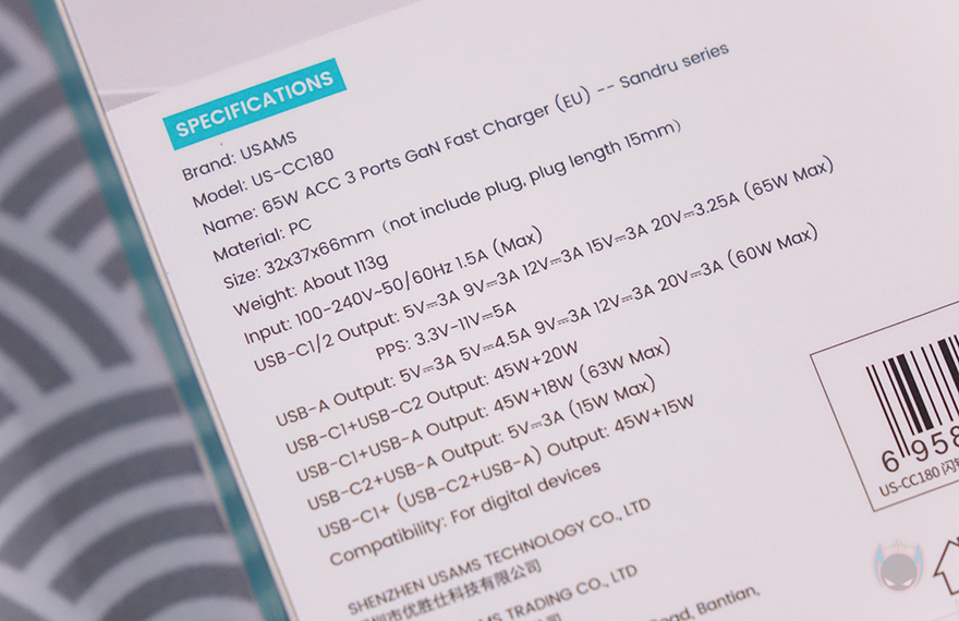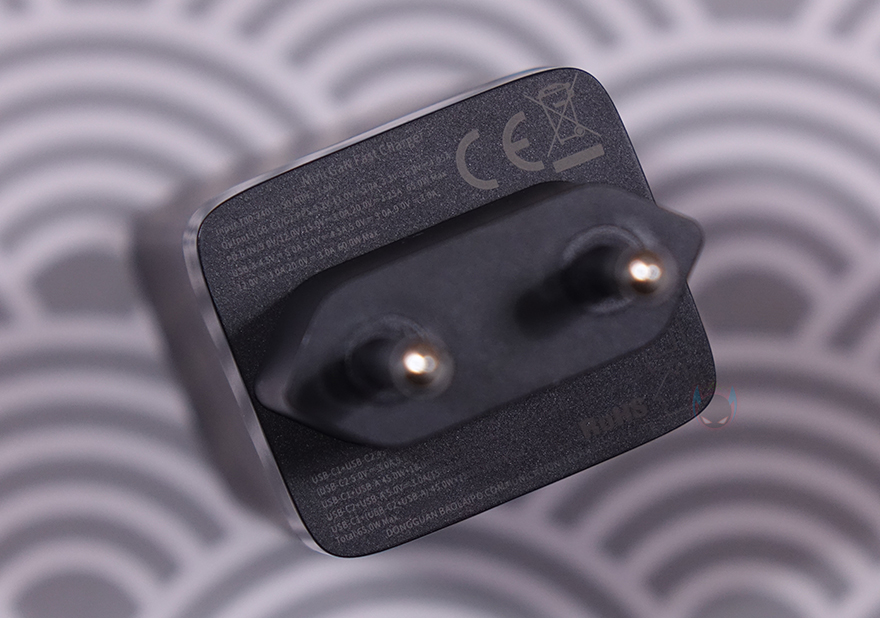 충전기를 좀 더 자세히 살펴보면, 한쪽 측면에는 USAMS 로고(Logo)를 새겨놨으며, 로고 기준 바로 오른쪽 측면에는 65W 충전표기를 해놨습니다. 그리고, 상단부분에는 USB 포트가 배치되어 있는데, 앞서 박스 패키지에서 확인했듯이, USB 포트는 총 3개 구성으로 개봉시에는 포트부분에도 보호비닐이 부착되어 있으며, 제거를 하면 무광의 메탈그레이 색상을 확인할 수 있습니다. 각 포트의 출력 지원은 싱글(Single) 1개만 사용할 때는 Type-C 포트는 최대 65W, Type-A도 60W까지 지원하며, 포트를 2개 사용할 때는 Type-C 2포트는 45+20W, Type-C1 + A 경우는 45+18W, Type-C2 + A경우는 각각 15W입니다. 그리고, 3개 모두 사용할 때는 45+15W를 출력합니다. 물론, 콘센트에 연결되는 플러그부분에 각 포트별 출력 표시를 해놨기때문에 사용전에 참고하면 되고, EU 플러그는 한국에서도 220V와 호환되죠.
