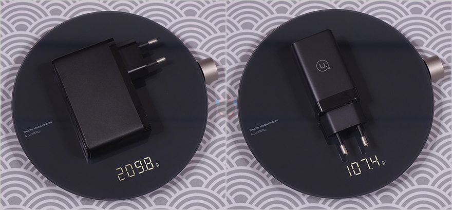 그럼, 유삼스(USAMS) 65W 고속충전기 US-CC180 모델을 살펴보는데, 앞에서 잠깐 언급했듯이 이 모델은 총 4가지 색상으로 출시되었습니다. 기본 색상이라 할 수 있는 블랙(Black)과 화이트(White)외에 그라데이션 컬러로 블루(Blue)와 핑크(Pink) 색상이 있죠. 기본적으로 블랙과 화이트이 흔하기 때문에 식상할 수 있는 소비자를 위해 추가 컬러 색상을 적용한거라 볼 수 있습니다. 그리고, 100W 고속충전기와 크기를 비교해보면, 확실히 작다라는걸 알 수 있는데, 전체 길이가 10cm정도 밖에 되지않으며, 무게도 약 2배정도 차이나서 확실히 휴대성에는 65W 충전기가 더 편하다라는걸 알 수 있습니다.