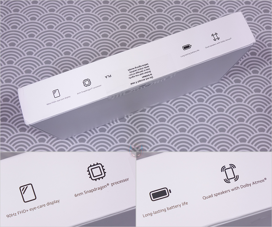 제품 패키지는 박스형태로 뒤에서 다시 언급하겠지만, 이번 레드미 패드 SE는 11인치 크기입니다. 그래서, 박스 크기도 거의 11인치 크기에 맞춘 형태로 전면에 제품 이미지를 실제 사이즈로 담고 있으며, 제품이름만 심플하게 새겨놨죠. 박스 측면에는 제품의 주요 특징으로 90Hz 주사율의 FHD+ 해상도와 시력보호 디스플레이, 6나노 스냅드래곤 프로세서, 긴 수명의 배터리, 돌비 애트모스 쿼드 스피커를 표기해 놨죠. 그리고, 다른 측면에는 간략하게 제품의 색상과 램(RAM)/저장장치(Storage) 용량, 제품 구성목록 표기를 확인할 수 있습니다.