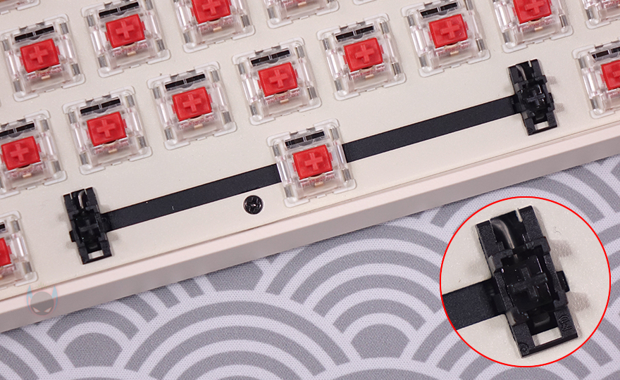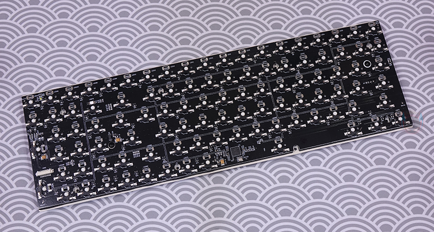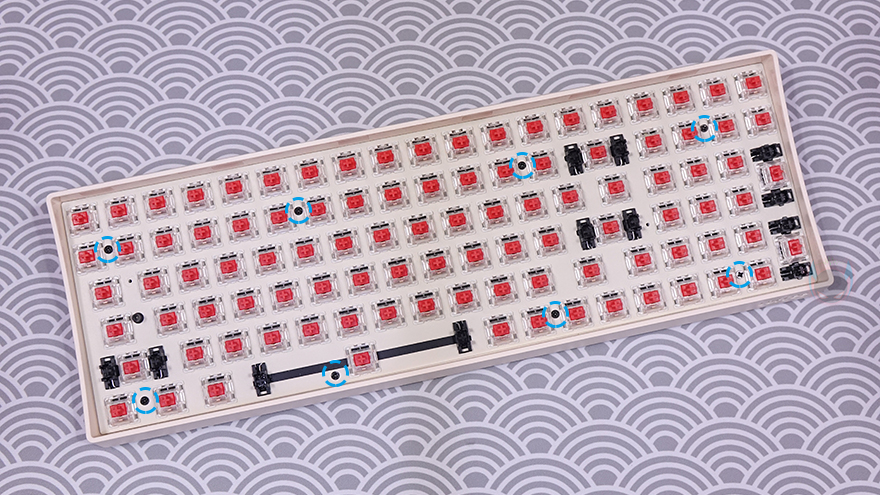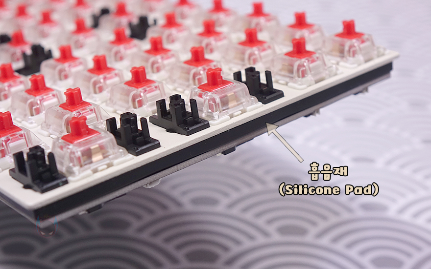 그리고, 키캡을 모두 분리하면 스틸(Steel) 재질의 보강판에 위아래 총 8개의 나사가 체결되어 있는데, 나사를 풀면 쉽게 보강판과 키보드 하판 케이스를 분리할 수 있습니다. 방금 스위치부분에서 확인했듯이 LED가 없기때문에 구조는 단순하며, 보강판과 PCB 사이에는 실리콘(Silicone)재질의 흡음재(Pad)가 적용된 것을 확인할 수 있습니다. 만약, 기본 흡음재만으로도 소음해결이 부족하다면, 하단 케이스 공간에 사용자가가 언제든지 추가로 흡음재를 넣을 수 있겠습니다.