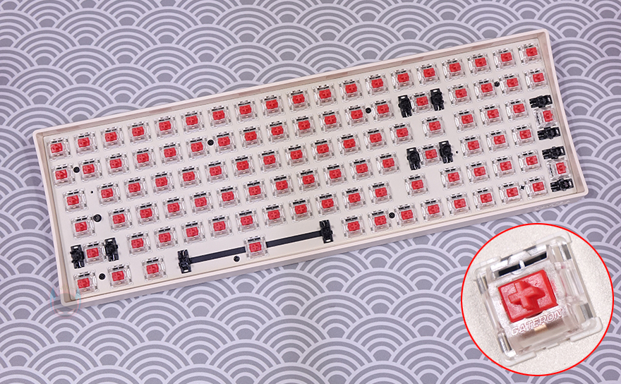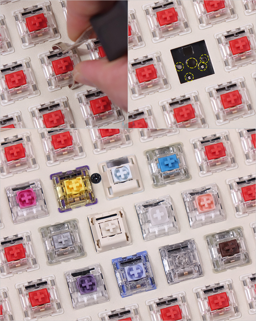 TOUCH 기계식 키보드의 스위치는 게이트론(Gateron)의 G Pro 스위치를 적용하고 있는데, Tofu 색상은 적축(Red switch)을, Gray 색상은 황축(Yellow switch)을 적용하고 있습니다. 그리고, 앞서 언급했듯이 LED는 적용되어 있지 않으며, 스위치를 교체할 수 있는 핫스왑(How-swap) 방식을 적용하고 있는데, 스위치를 분리하면 PCB 구멍이 5개임을 확인할 수 있어서, 5 pin과 3 pin 스위치 모두 호환 사용이 가능하죠. 또한, 스페이스-바 같은 긴 스위치들의 스테빌라이저는 체리식으로 적용했는데, 기본 윤활처리도 되어있습니다.