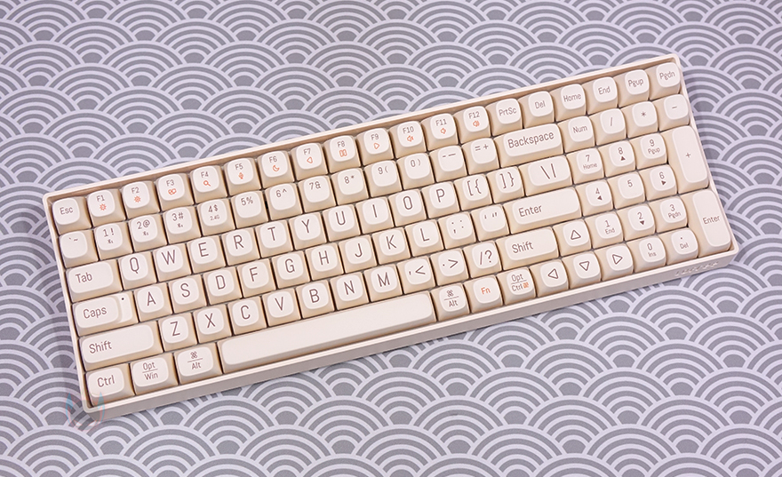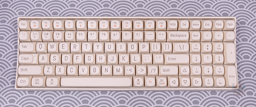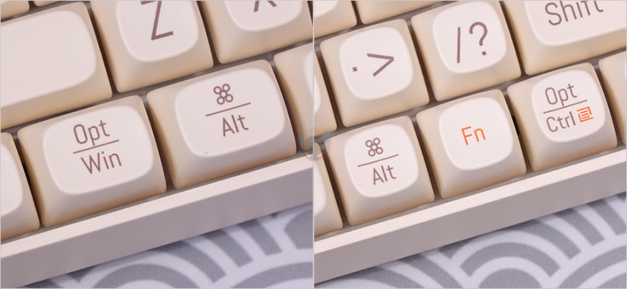 Lofree TOUCH 기계식 키보드의 키캡(Keycaps)은 PBT 재질이며, 뒤에서 확인하겠지만, LED 백라이트는 없기때문에 이중사출 방식은 아니죠. 하지만, Tofu와 Gray 키보드 색상에 맞춰서 기본 키캡들 색상 역시 통일시켰으며, 앞서 기본사양 표기에서 확인했듯이 운영체제(OS) 지원은 윈도우(Windows)뿐만 아니라 맥(Mac), 안드로이드(Android)에서도 사용이 가능하기 때문에, 키캡 자판 인쇄 일부에는 윈도우와 맥 OS 기능을 동시에 해놨습니다. 그리고, Tofu 색상경우 오렌지색상에 가까운 교체용 포인트 키캡 하나를 추가로 제공해주고 있는데, ESC키 라인에 키캡과 교체할 수 있죠. 또한, 측면에서 전체 키캡 높이를 보면 17.5mm로 가장 높은 SA 프로파일보다 더 높은데, 앞서 키보드 측면에서 본 곡선라인이 키캡에서 나오는 거라는 걸 알 수 있습니다. 물론, 이런 곡선과 경사도까지 신경 쓴 이유는 오랜 타이핑시 손가락의 피로도를 줄이기 위함이라고 보면 됩니다. 또한, 시작에서 언급했듯이 현재 Lofree의 대표 키보드 모델이 TOUCH 기계식 키보드이기 때문에 다양한 디자인의 키캡 상품들을 출시하고 있는데, 지금까지 40가지 이상의 디자인을 출시했으며, 앞으로도 계속 늘어날 예정이기 때문에 키캡 상품만으로 자신 취향만의 TOUCH 기계식 키보드 분위기를 연출할 수 있겠습니다.