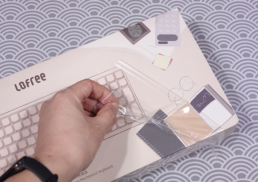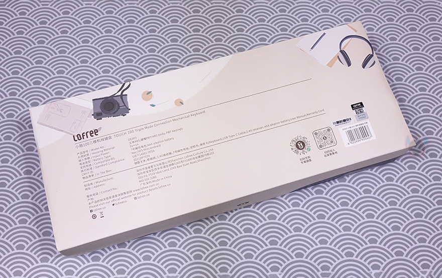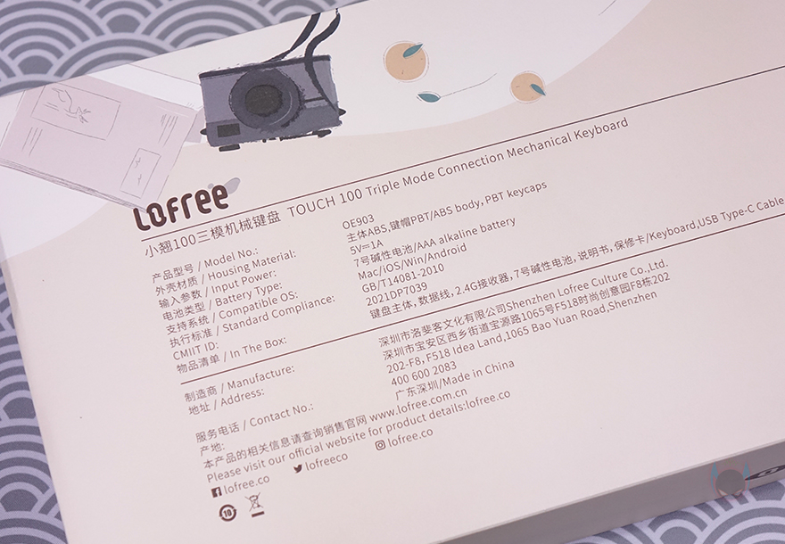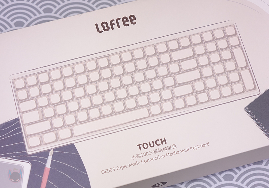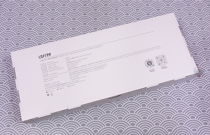 제품 패키지는 박스형태와 겉표지 방식으로 포장은 전체 비닐 밀봉으로 처리되어 있어 소비자입장에선 판매 제품에 신뢰를 가질 수 있습니다. 겉표지 배경디자인만 봐도 Lofree가 평소 추구하는 사무적인 환경에 감성적인 느낌으로 디자인했는데, 한눈에 봐도 클래식한 디자인입니다. 그리고, 표지 전면에는 제품 이미지와 제품명정도만 확인할 수 있는데, 아래에 100 키 배열과 3가지 연결방식(Triple Mode Connection) 표기도 확인할 수 있어서, 요즘 트렌드로 담고 있다는 걸 미리 알 수 있습니다. 표지 후면에는 간략하게 제품 사양을 표기해 놨는데, TOUCH 키보드의 모델명은 OE903이라는 점과 뒤에서 확인하겠지만, 배터리가 건전지로 사용된다라는 점을 미리 알 수 있죠.