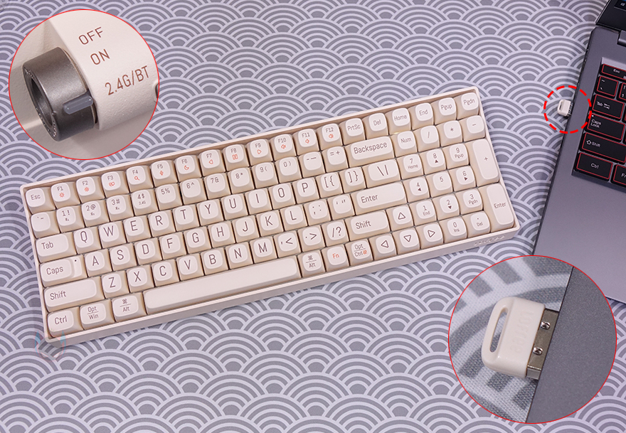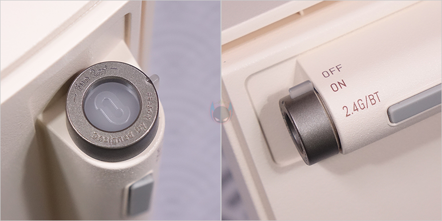 완전 측면 상태에서보면 9˚ 곡선 라인 높이가 자연스러울 정도로 곡선의 미가 더 잘 느껴지고, 앞부분에 높낮이 받침 역할이 되는 밑바닥 오른쪽 측면에는 원형 디자인의 스위치 방식으로 Off, On, 2.4G/BT 3가지 모드를 선택할 수 있게 해 주는데, Off는 전원 Off를 의미하며, On은 전원 켜짐과 동시에 유선 모드, 나머지 2.4G/BT는 무선 모드로 뒤에서 확인하겠지만, 다른 무선 키보드처럼 Fn키 조합으로 디바이스 선택으로 연결됩니다. 또한, 원형 디자인의 가운데 부분은 유선과 무선 연결 시 작동상태 확인으로 화이트색상 LED로 점등되었다 꺼집니다. 그리고, 같은 위치에 전면 방향에는 유선시 사용되는 USB 전원케이블과 연결되는 USB Type-C 포트가 배치되어 있죠.