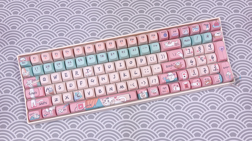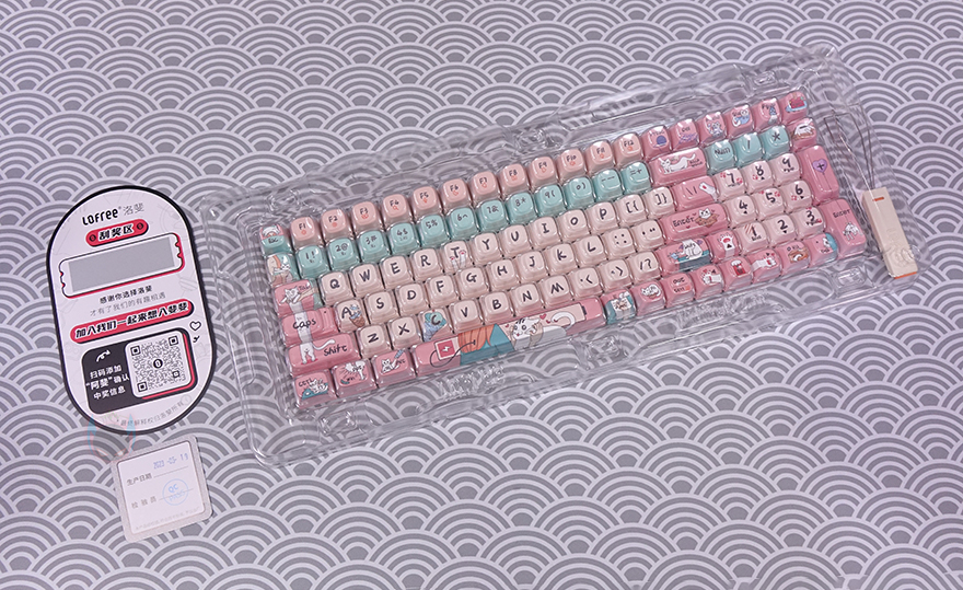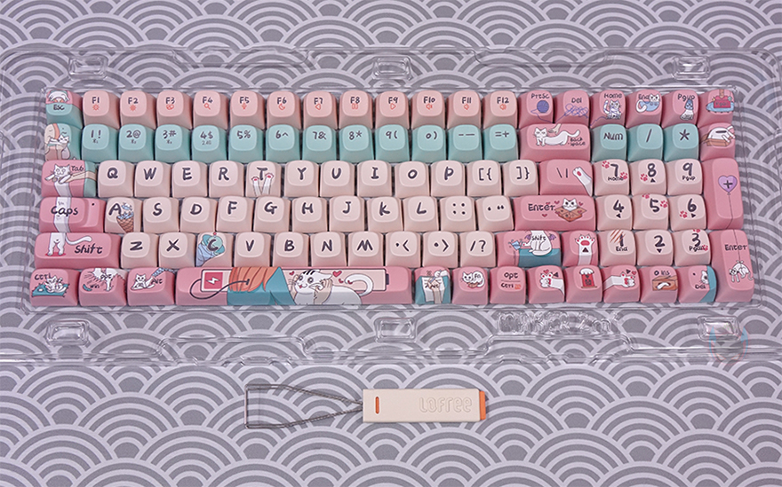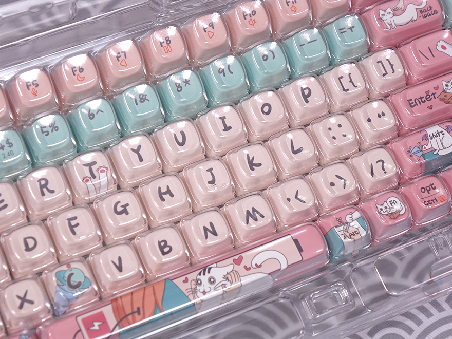 실제로 여러 키캡(keycpas) 상품들 중 인기 상품 중 하나인 Dear Kitty 키캡 상품을 살펴보면, 박스 포장에 박스 전체까지 밀봉처리가 되어있으며, 박스를 뜯지 않고 외부에서 키캡 디자인 일부를 볼 수 있게 공개되어 있습니다. 박스를 열어서, 키캡은 흔들리거나 분실되지 않게 각 키 크기에 맞춘 캡-방식으로 포장되어 있으며, 키캡 교체에 필요한 키-풀러(Key puller)도 기본 제공해주고 있으며, 안내카드와 품질보증서도 구성품에서 확인할 수 있죠. 실제로 기본 키캡 색상을 분리하고, Dear Kitty 키캡으로 교체해보면, 또 다른 분위기 연출이 느껴지기 때문에 앞서 언급했듯이 자신만의 취향으로 키캡을 선택해 보는 것도 좋을 것 같습니다.