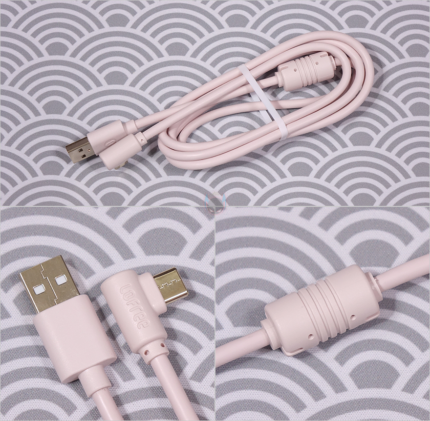 TOUCH 기계식 키보드 역시 Fn키 조합으로 부가기능들을 지원해주고 있으며, 앞서 모드 스위치로 통해 유선, 무선 2.4G, 블루투스 3가지 연결방식 지원한다고 했는데, 블루투스와 무선 2.4G 모드는 스위치로 모드를 선택한 후 Fn+1/2/3/4 숫자키 조합으로 연결할 수 있게 갖추고 있습니다. 이밖에 바로 위에 F숫자 키들 역시 F1~F2는 화면밝기조절, F3은 창 간 전환, F4는 검색, F5는 윈도우 운영체제에서 Cortana 실행, F6은 절전 모드, F7~F9는 재생컨트롤(Media play), F10은 음소거, F11~F12키 조합으로는 볼륨조절 기능을 갖추고 있죠. 참고로, Fn키 바로 오른쪽에 있는 Ctrl키 조합으로는 마우스 오른쪽 버튼을 클릭하면 나오는 메뉴(Menu)를 실행합니다. 끝으로, 유선 모드시 사용되는 USB 전원케이블은 약 1.5m 길이에 USB Type-A to C 인터페이스를 가졌는데, 키보드와 연결되는 Type-C는 90˚ 각도로 연결이 편하도록 했으며, 신호손실 최소화를 위해 노이즈-필터(Noise filter)와 인터페이스에 금도금(USB gold plated) 처리를 해놨습니다.