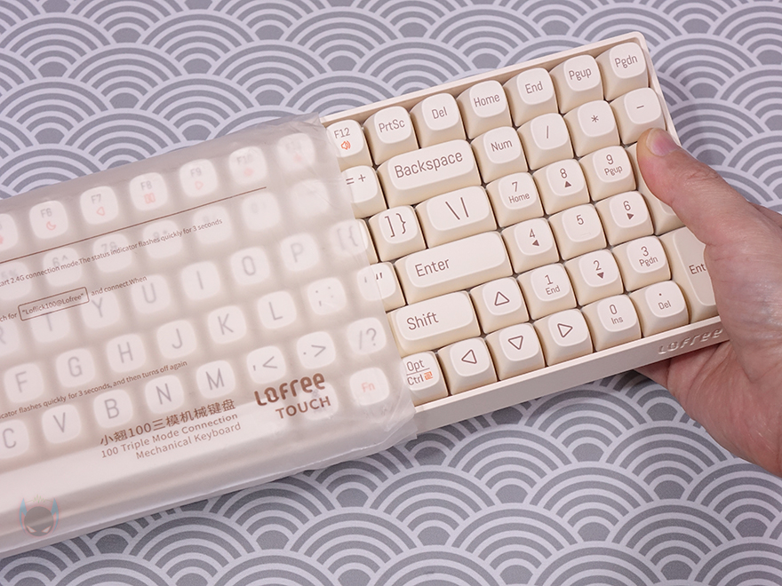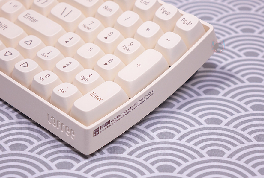 리뷰에선 Tofu 색상의 100키 배열 모델로 살펴보는데, 요즘 트렌드 중 하나인 96~100 키 배열에 맞춰 TOUCH 역시 전형적인 100 키 배열을 갖추고 있습니다. 숫자 키패드와 방향키 외에 일부 특수키를 갖추면서도 크기는 104~108 키 배열보다 작은 것이 100 키 배열의 특징이죠. 건전지를 수납하지 않은 상태의 키보드는 무게는 약 1kg이며, TOUCH 키보드의 가장 큰 특징은 측면에서 확인할 수 있는데, 바로 9˚의 곡선 라인으로 만들어진 높이입니다. 타이핑 효율성은 높이면서, 미적인 감각까지 살린 디자인이죠. 마치 타자기를 모티브 한 느낌이 들면서도 타자기 같지는 않은데, 전체적인 키보드 색상과 조합되어 클래식한 감성을 자아냅니다. 또한, 오른쪽 측면에는 콘셉트 문구로 포인트를 주고 있으며, 그대로 아래로 이어지는 맨 오른쪽 구석에는 음각으로 Lofree 로고(logo)를 새겨놨습니다.