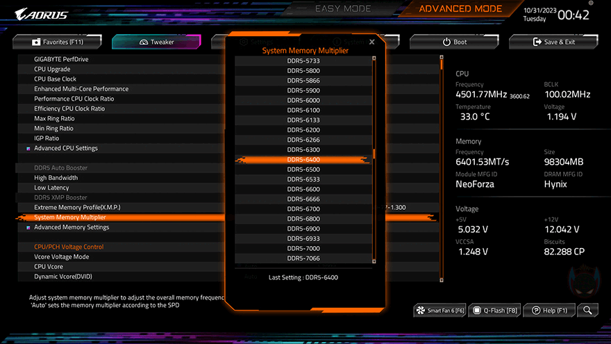 성능 확인 시작 전에 언급했듯이 MDK5 DDR5 6000MHz 96GB Kit 메모리는 6000MHz XMP/EXPO 프로파일을 가졌지만, 램 타이밍값은 기본값 수준에 불과합니다. 여기에 용량도 대용량이죠. 따라서, 성능을 더 올리고 싶다면 수동오버클럭은 필수입니다. 그래서, 이번엔 프로파일의 전압인 1.3V을 그대로 유지하고, 클럭은 6400MHz으로 올리고, 램 타이밍은 40-40-40-77보다 더 낮춰서 32-38-38-77로 적용해 벤치마크를 실행해 봤습니다.