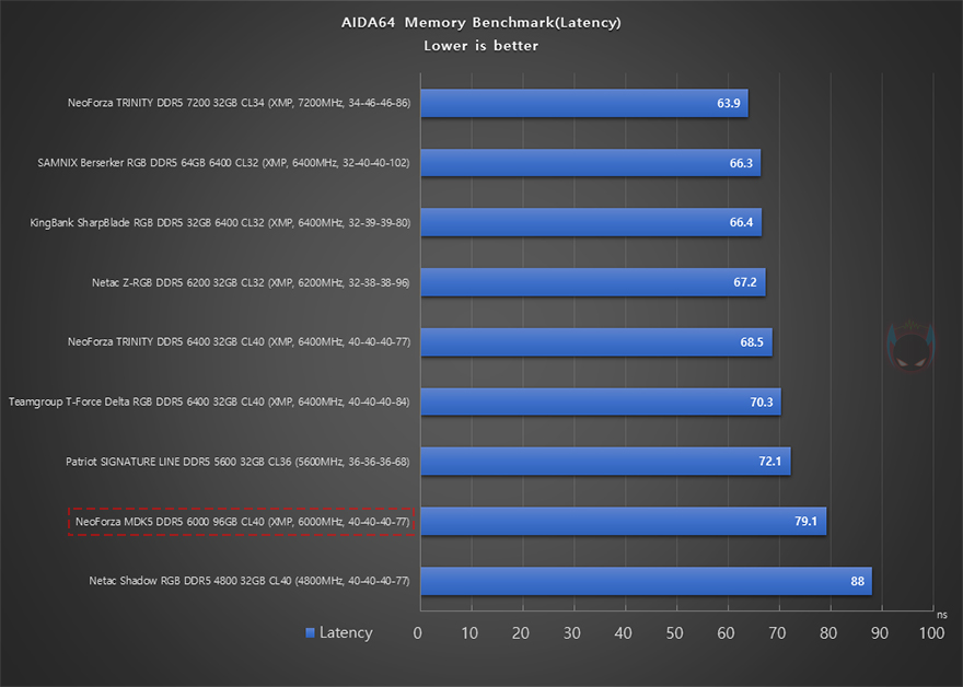 확인결과 AIDA64 Cache&Memory Benchmark에선 대역폭도 늘어났지만, 눈에 띄게 레이턴시가 줄어든 것을 확인할 수 있습니다. 물론, 96GB 용량보다 작은 32/64GB 비교 모델들보다는 느리지만, MDK5 DDR5 6000MHz 96GB Kit가 96GB 대용량이라는 점을 감안하면 앞서 XMP/EXPO 프로파일로 사용할 때보다 많이 빨라진 겁니다. 뿐만 아니라, Passmark PerformanceTest, UL Benchmark PCMARK 10, Procyon 벤치마크 모두에서도 6400MHz 32GB 비교 제품들에 근접하거나 앞서는 결과도 보여줬죠. 즉, 방금 언급했듯이 64GB 이상의 대용량으로 메모리 구성을 한다면 오버클럭과 램 타이밍은 필수라고 봐야 합니다. 물론, 성능에 중점을 두는 소비자라면 말이죠.