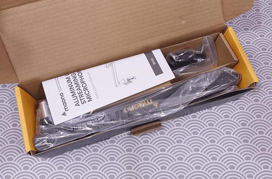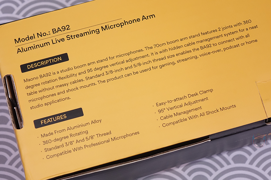 그리고, 박스 후면에는 MAONO(마오노) 특징인 모든 제품의 소개문구를 BA92 역시 박스 후면에 담고 있으며, 방금 언급했던 주요 특징 표기와 추가로 오른쪽에 제품 이미지와 함께 각도와 회전 범위를 손쉽게 이해하도록 담고 있습니다. 박스를 열어보면, 포장은 구성품마다 모두 비닐포장으로 처리되어 있으며, 전체 구성은 상/하로 분리되는 암 2개, 클램프, 볼헤드, 렌치, 제품설명서로 이루어져 있습니다.