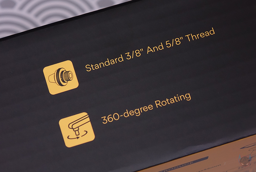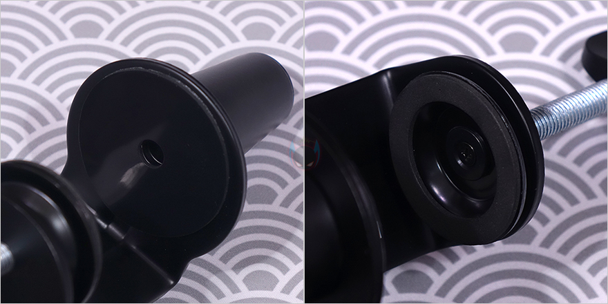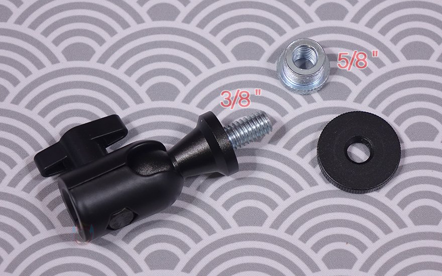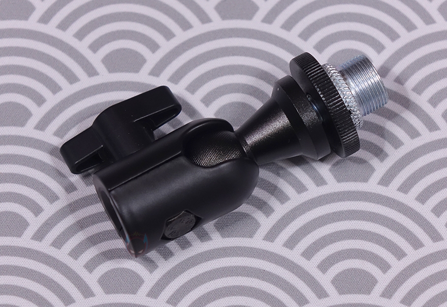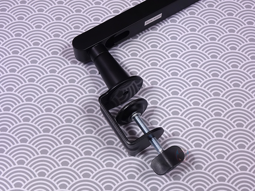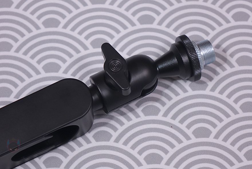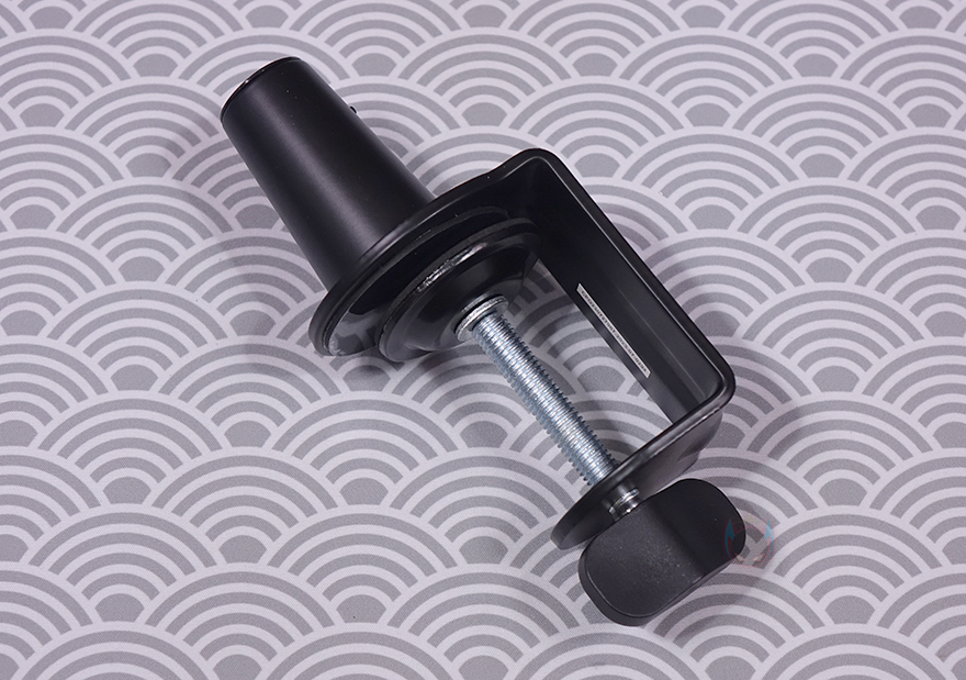 마이크를 장착할 수 있게 해주는 볼-헤드는 마이크 연결부의 기본 나사 규격은 3/8"인치지만, 5/8"인치 어댑터가 함께 제공되기 때문에 두 가지 규격으로 마이크 장착을 할 수 있으며, 앞서 확인한 상단 암 연결부에 볼-헤드를 풀어서 끼우고 다시 체결하는 방식으로 연결은 어렵지 않습니다. 클램프 역시 기존의 마이크 붐 암에서 흔히 볼 수 있는 클램프 형태로 두께 범위는 10~55mm이며, 최대 벌렸을 때는 약 57mm입니다. 물론, 상하 안쪽으로 접지력과 테이블 훼손방지를 위한 패드가 부착되어 있죠. 그리고, 역시 하단 암과 연결했을 때 홈 부분에는 회전 압력조절을 할 수 있게 측면에 나사가 적용되어 있습니다.