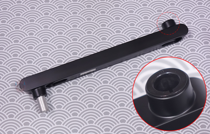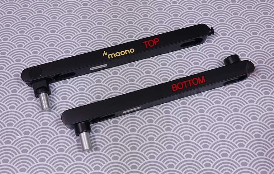 그럼, 본격적으로 MAONO(마오노) BA92 마이크 붐 암을 살펴보면, 개봉 시 기본 상태는 상/하로 각각 나뉘는 암(Arm) 2개가 있는데, 상단 암(Top Arm)은 MAONO 로고(logo)를 새겨놨으며, 길이도 하단 암(Bottom Arm)보다 좀 더 깁니다. 좀 더 정확히는 상단 암은 355mm가 넘고, 하단 암은 넘지 않는 길이죠. 물론, 암 재질은 앞서 제품박스 표기에서 확인했듯이 알루미늄(Aluminum)이며, 상단 암 앞부분에는 뒤에서 다시 확인하겠지만, 볼헤드와 연결되는 연결부가 있으며, 반대쪽은 하단 암과 연결되는 연결부로 -25˚~70˚ 범위로 총 95˚의 각도조절을 할 수 있도록 지원하고 있습니다. 물론, 반대쪽에 움직임 압력조절을 할 수 있게 육각 나사도 적용되어 있죠. 하단 암은 특별한 거 없이 한쪽에는 상단 암과 연결되는 홈이 있고, 반대쪽에는 클램프와 연결되는 연결부가 있습니다.