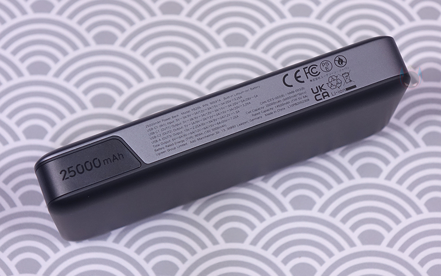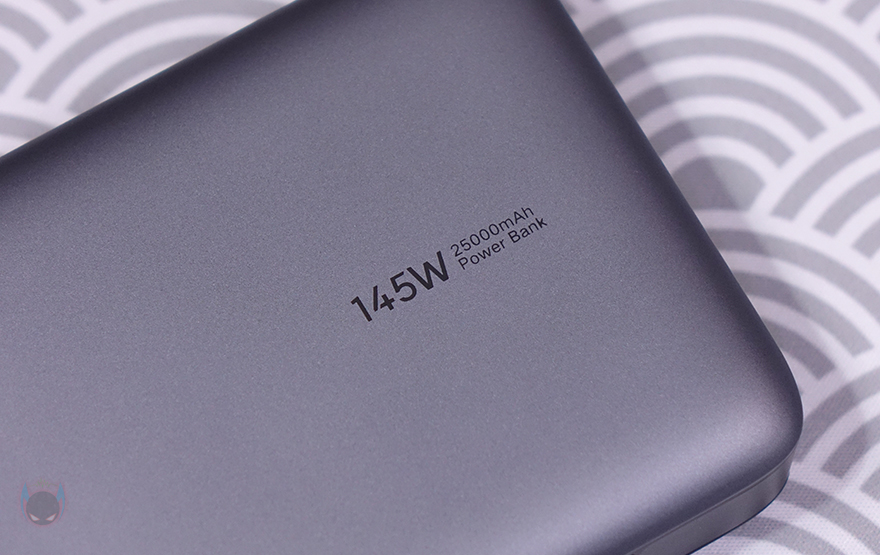 본격적으로 유그린(UGREEN)의 145W 25,000mAh 보조배터리(PB205)를 살펴보면, 제품 상단 표면은 메탈 스프레이 페인트 처리로 금속 느낌을 표현했으며, 왼쪽 UGREEN 로고와 함께 반대쪽 오른쪽에는 145W 25000 mAh Power Bank 표기를 해놨습니다. 참고로, 이 제품이 나오기 전에 동일한 디자인으로 100W 20,000mAh 보조배터리 제품이 먼저 나왔는데, 100W 20,000mAh 보조배터리 모델명은 PB207로 구분하고, 보조배터리 충전속도는 65W로 동일하지만, 100W 20,000mAh 보조배터리는 PD 3.0 규격이고, 145W 25,000mAh 보조배터리는 PD 3.1 규격이기 때문에 최대 출력 충전속도에서 145W 25,000mAh 보조배터리가 더 빠르고, 나머지 일부 포트에서도 속도차이가 있어서 총 출력 충전속도도 145W 25,000mAh 보조배터리가 빠르죠. 또한, 내장된 배터리 셀은 이미 전기차로 유명한 테슬라에 사용되는 배터리 셀과 동일합니다.