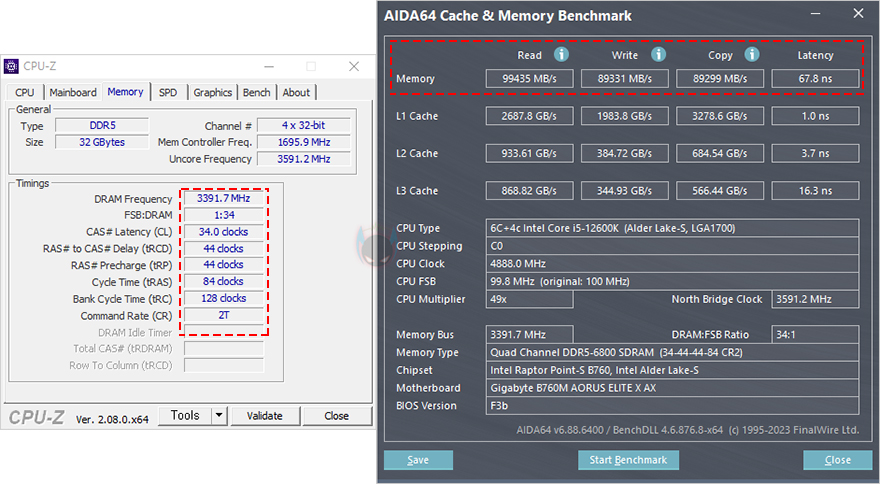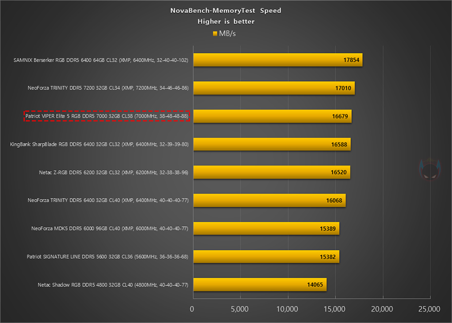 그리고, 앞서 XMP 프로파일에서도 확인했듯이 7000 MHz XMP값의 전압 같은 경우 1.45V로 클럭대비 높게 설정되어 있습니다. 하이닉스 A다이(혹은 M다이) 모듈과 PMIC칩 언락이 적용되었다라는 걸 쉽게 확인시켜주기 위해서 설정값을 이렇게 저장했다 판단할 수 있는데, 방금 확인했듯 이 2가지 조건에 메인보드 PCB 레이어층만 뒷받침되어도 DDR5 기본 최대 전압인 1.435V 이하에서 7400~7600MHz까지도 적용시킬 수 있습니다. 실제로, 램 타이밍값을 그대로 유지하고, 전압도 낮춘 상태에선 VIPER Elite 5 RGB DDR5를 7600MHz까지 추가로 오버클럭할 수 있었고, 성능도 더 올라간 것을 확인할 수 있었습니다. 물론, 방금 언급했듯이 PMIC칩 언락이 적용되었다라는걸 쉽게 확인시켜 주기 위해 1.45V 전압이 설정된 거이라 8층 PCB이상의 고가형 메인보드와 등급이 높은 고가형 CPU를 사용하고 있다면, 그리고, VIPER Elite 5 RGB DDR5 메모리의 7800~8000 MHz이상의 오버클럭도 가능하겠습니다.