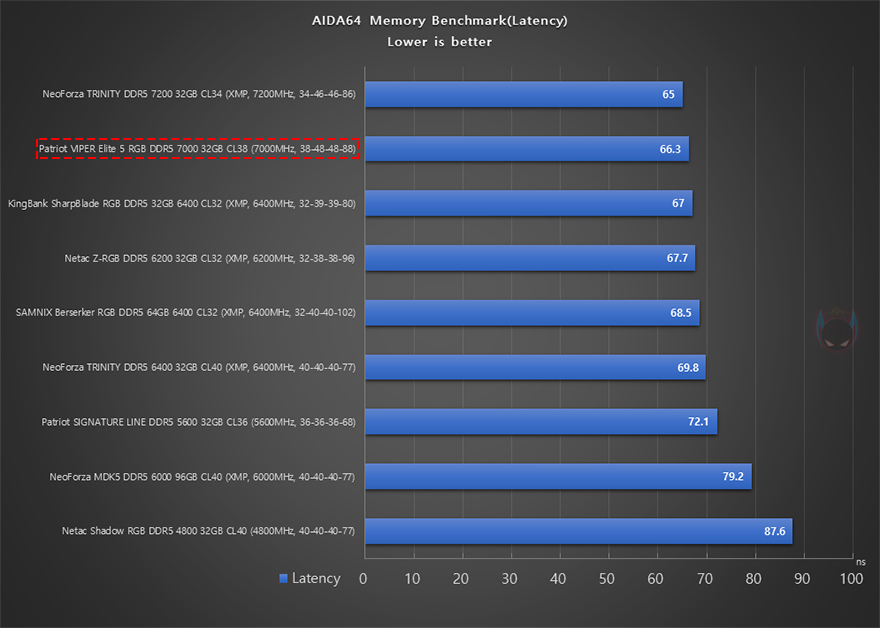 방금 확인했듯이, 리뷰에 사용된 VIPER Elite 5 RGB DDR5 최상급 모델인 7000 MHz에는 3개의 XMP 프로파일이 저장되어 있습니다. 6600MHz, 6800MHz, 7000MHz 이 중 당연히 성능이 가장 좋은 것은 7000MHz입니다. 그래서, 7000MHz XMP 프로파일 설정으로 VIPER Elite 5 RGB DDR5 메모리의 성능을 확인해 보면, 메모리 성능으로 가장 많이 이용되는 AIDA64의 Memory Benchmark를 통해서 전체 DDR5 비교 모델들 중에서도 상위급에 속하는 걸 확인할 수 있습니다.
