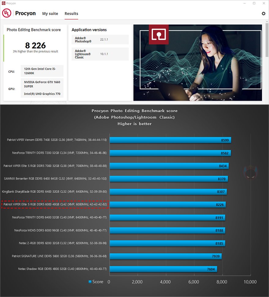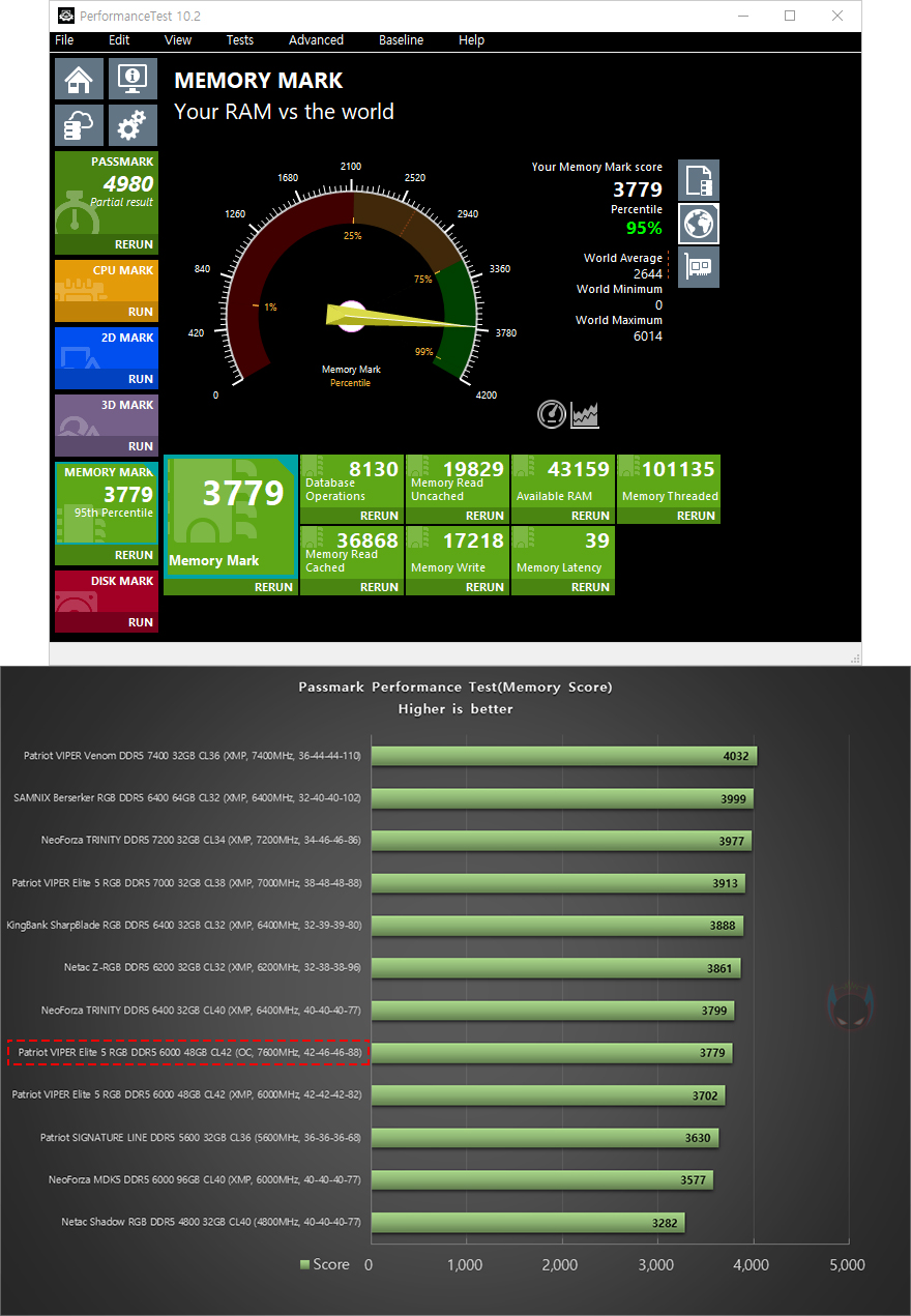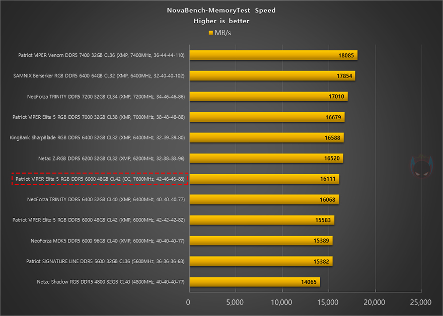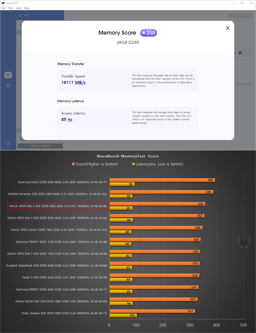 그리고, 시작에서도 언급했듯이 24GB, 48GB 용량은 논-바이너리 규칙이라 성능보다는 용량과 안정성에 중점을 두고 나온 메모리입니다. 그래서, VIPER Elite 5 RGB DDR5 48GB(24GBx2) 메모리를 XMP 프로파일 6000MHz으로 불러와 적용해 성능확인을 해보면, AIDA64 Memory Benchmark를 비롯해, NovaBench Memory Test, Passmark PerformanceTest Memory Mark까지 용량보다 클럭이나 램타이밍 위주로 성능을 보여주는 벤치마크 프로그램에서 동급 클럭의 메모리들과 비슷한 성능을 보이거나 이보다 낮은 클럭의 메모리보다 낮은 성능을 보여줍니다. 물론, 논-바이너리의 등장이 용량이기 때문에 실제 메모리 영향이 높은 Adobe 포토샵이나 프리미어 프로로 벤치마크할 수 있는 Procyon에선 동급 클럭 메모리들 보다 높은 성능을 보여주죠. 물론, 논-바이너리 특성상 용량이 클수록 성능은 낮아집니다. 쉽게 말해, 48GB(24GBx2)보다는 96GB(48GBx2) 메모리의 성능이 낮다라는 거죠.