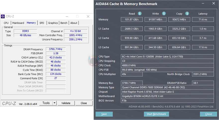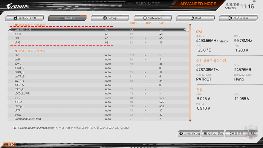 방금 확인했듯이 VIPER Elite 5 RGB DDR5 48GB(24GBx2) 메모리는 논-바이너리 메모리 특성상 바이너리 메모리보다 성능이 낮습니다. 물론, 이를 보완하는 방법도 있죠. 바로, 오버클럭입니다. 마이크론 메모리를 제외한 다른 메모리 업체들은 SK 하이닉스 M다이 모듈을 사용해 이부분을 보완하는데, 패트리어트 역시 VIPER Elite 5 RGB DDR5 48GB(24GBx2) 메모리에 하이닉스 M다이 모듈을 사용했죠. 그래서, 추가적인 오버클럭이 가능한데, 실제로 1.39~1.4V 전압으로 오버클럭을 시도했을 때 7600MHz까지 적용되는걸 확인할 수 있었고, 램-타이밍값도 최대한 XMP 프로파일의 값과 비슷하도록 유지했습니다. 이렇게 오버클럭을 하면 방금 확인했던 논-바이너리 메모리로써의 아쉬운 성능부분은 어느정도 보완할 수 있죠. 참고로, 시중에 판매되는 제품들 중 그리고 패트리어트의 VIPER Venom DDR5 모델 중에도 이런 논-바이너리 모델이 있는데, 8000~8200MHz까지 XMP 프로파일로 적용한 모델이 있습니다. 물론, 앞서 언급했듯이 논-바이너리 특성상 용량이 클수록 성능이 낮아지기때문에, 이렇게 높은 클럭은 대부분 단일 24GB용량의 48GB(24GBx2) 듀얼키트 제품에 해당되고, 단일 48GB용량의 96GB(48GBx2) 듀얼키트는 이보다 클럭이 낮습니다.