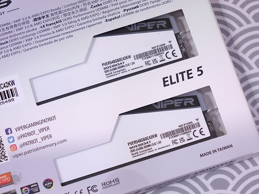 VIPER Elite 5 RGB DDR5 48GB(24GBx2) 메모리 역시 Elite 5 RGB DDR5 모델 중 하나이기 때문에, 제품 박스는 이전 시간에 먼저 만났던 바이너리 모델(https://piscomu.com/4442)과 동일합니다. 박스 전면에 제품 이미지를 담고 있으며, 모델명과 함께 용량과 클럭 표기를 확인할 수 있는데, 리뷰에 사용된 모델은 단일 24GB용량의 듀얼키트인 48GB 모델입니다. 참고로, Elite 5 RGB DDR5에 논-바이너리 용량은 48GB(24GBx2)와 96GB(48GBx2) 2가지가 있으며, 클럭은 6000MHz으로 나왔습니다.