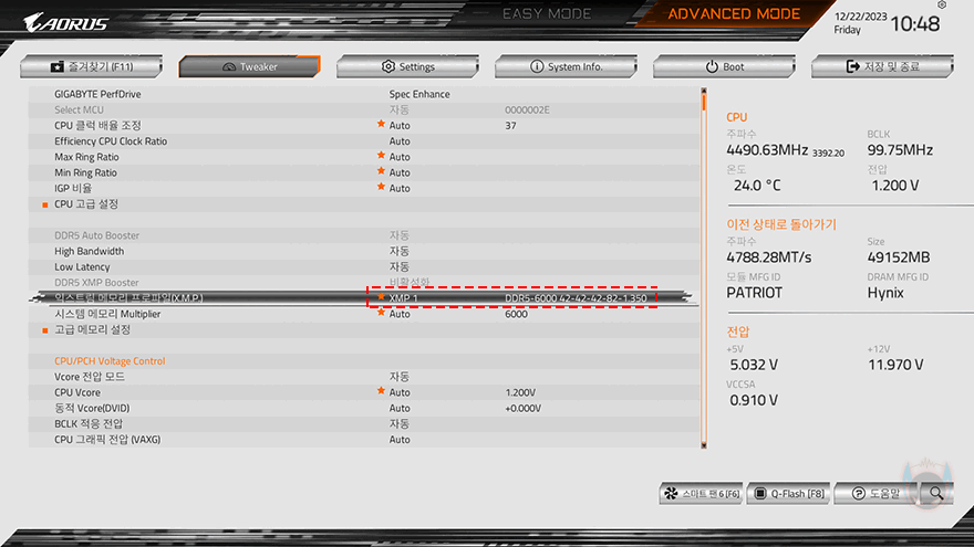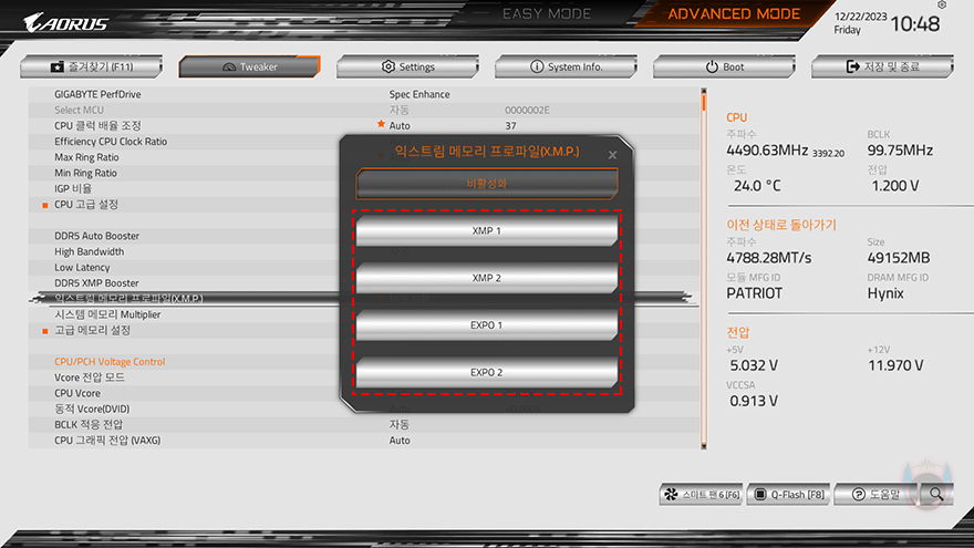 그리고, VIPER Elite 5 RGB DDR5 48GB(24GBx2) 메모리는 앞서 확인했듯이 6000MHz 클럭으로 출시되었는데, 이는 XMP 프로파일이 적용되었다라는 걸 의미하기 때문에, 메인보드 CMOS에서 XMP 프로파일을 확인해 보면, 인텔 XMP 프로파일 2개, AMD EXPO 프로파일 2개로 총 4개가 저장된 것을 확인할 수 있습니다. 또한, 클럭은 6000MHz외에 5600MHz으로 하나 더 설정된 것을 확인할 수 있죠.