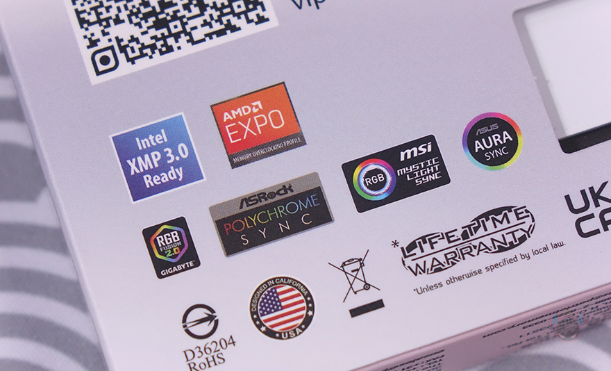 박스 후면도 다른 Elite 5 RGB DDR5 모델과 동일하게 박스를 개봉하지 않고도 내부에 포장된 제품 실물 일부분을 볼 수 있게 공개되어 있는데, 정확히는 스펙사양의 라벨 스티커를 확인할 수 있죠. 그리고, DDR5의 기본 클럭보다 높은 클럭이 적용되었기때문에, 당연히 인텔 XMP 프로파일과 AMD EXPO 프로파일 방식으로 지원하며, RGB 메모리라서, 각 메인보드 제조사들의 RGB Sync 연동 지원 표기도 확인할 수 있습니다. 물론, 이미 전 시간에 Elite 5 RGB DDR5에서 확인했듯이 VIPER 자체의 RGB 소프트웨어도 제공을 해줍니다. 박스를 열어보면, 메모리 포장 역시 기존 제품들처럼 투명-캡 방식이며, 제품 구성도 해당 모델의 메모리와 VIPER 로고 스티커 제공 구성으로 이루어져 있죠.