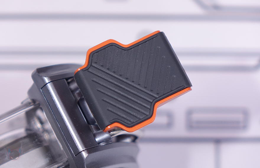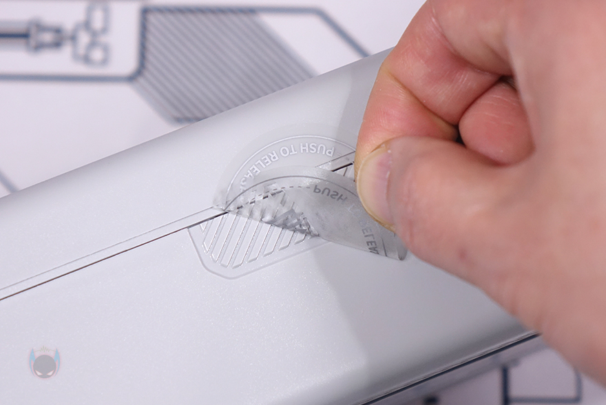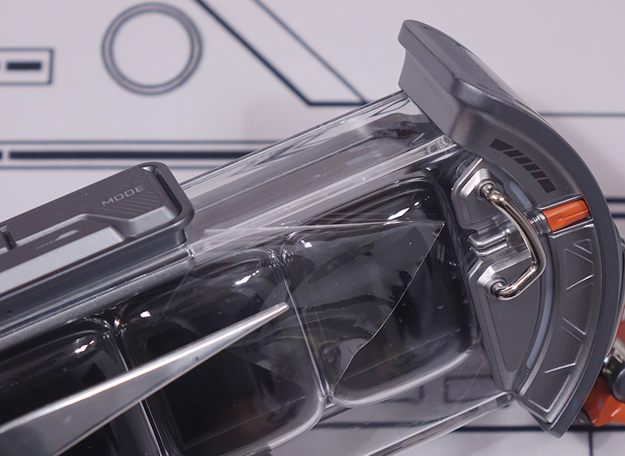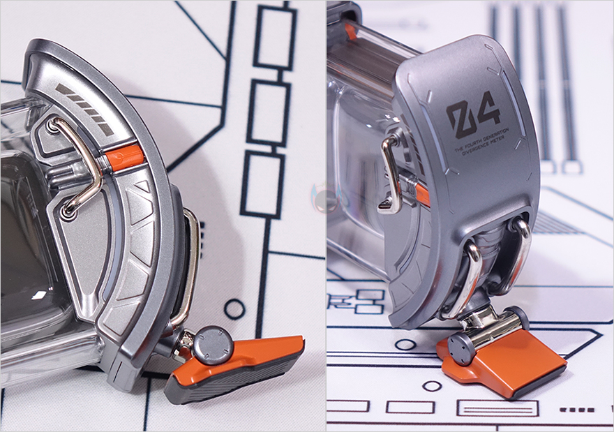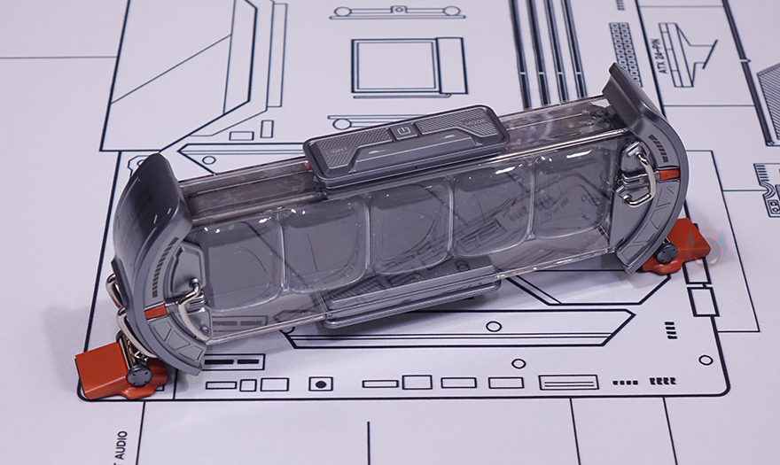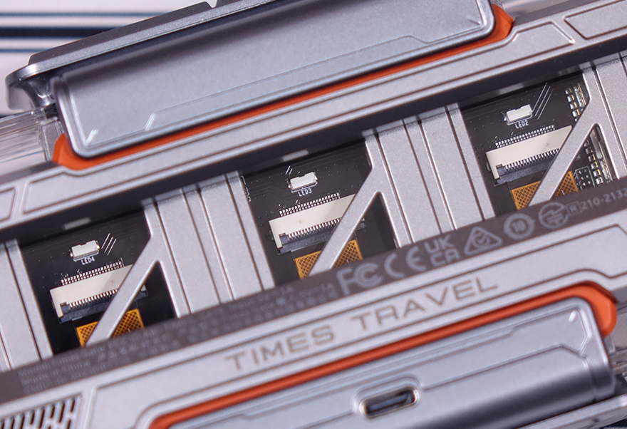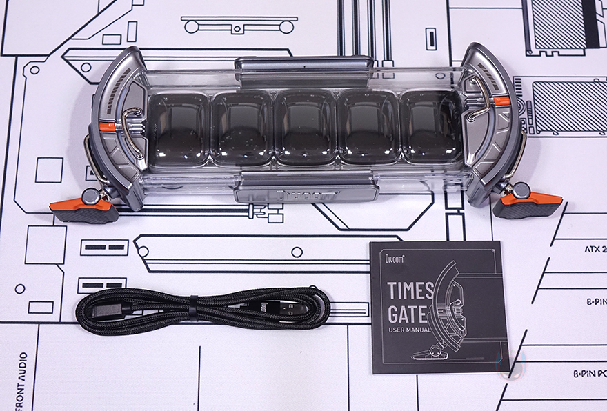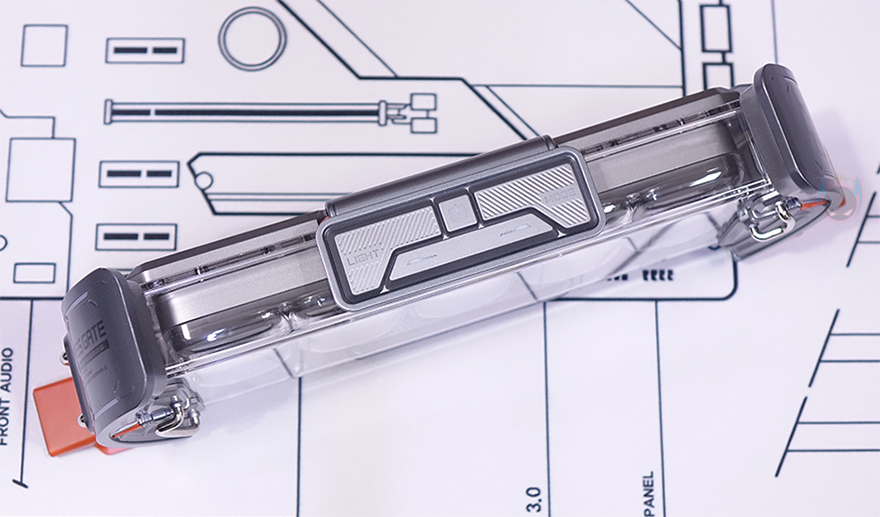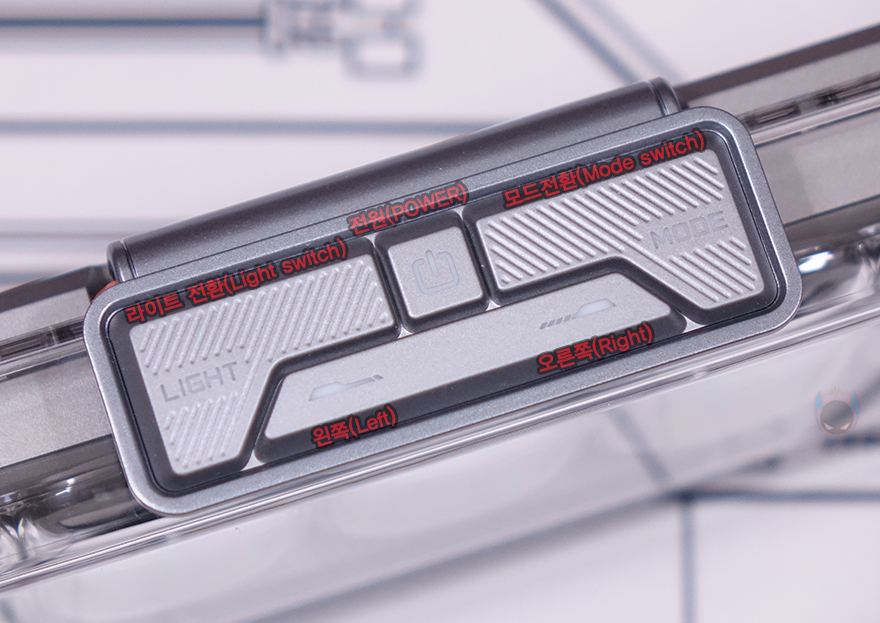 제품 상단(Top)에는 중앙 위치에 버튼들(Buttons)이 배치되어 있는데, 가운데 전원(Power) 버튼을 비롯해 양쪽으로 각각 라이트 전환(Light switch)과 모드 전환(Mode switch) 버튼이 배치되어 있으며, 앞부분에는 좌우(Left/Right) 버튼이 배치되어 있습니다. 라이트 전환 버튼은 뒤에서 확인하겠지만, 방금 언급했던 양쪽 게이트 부분에 라이트닝 모드를 변경하는 기능을 가지고 있으며, 모드 전환은 디스플레이(Display) 화면을 전환하는 기능을 가졌습니다. 그리고, 제품 후면에는 함께 제공되는 USB 전원케이블(Power cable)과 연결되는 USB Type-C 포트가 배치되어 있으며, 후면에서 디스플레이 내부도 일부 확인할 수 있죠.