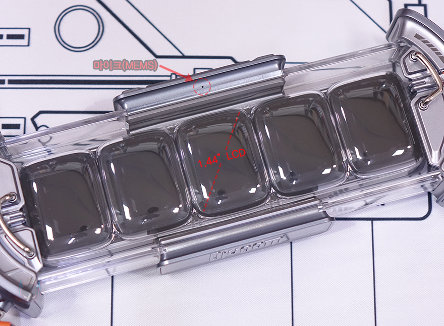 좀 더 자세히 살펴보면, 전면에는 이 제품의 가장 큰 특징인 바로 디스플레이(Display)가 배치되어 있는데, 1.44인치(inch) 크기의 LCD가 나란히 옆으로 5개 나열되어 있습니다. 뒤에서 확인하겠지만, 바로 이 5개의 화면을 통해서 사용자가 원하는 화면을 설정할 수 있는거죠. 물론, 픽셀(Pixel)로도 표현이 가능한데, 128x128 픽셀을 지원합니다. 그리고, 상단 버튼의 전면에는 외부 소리에 반응하는 MEMS 마이크(Mic)가 적용되어 있죠. 또한, 양쪽에는 제품 이름처럼 게이트(Gate) 디자인을 적용하고 있는데, 전면과 측면에 모두 라이트닝(Lightning) 효과를 볼 수 있게 처리되어 있습니다.