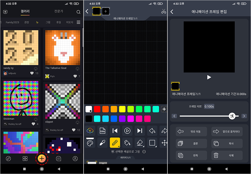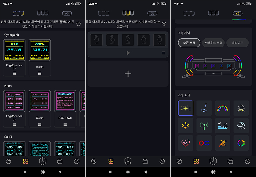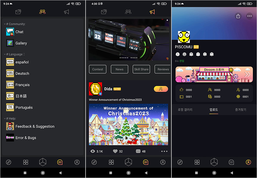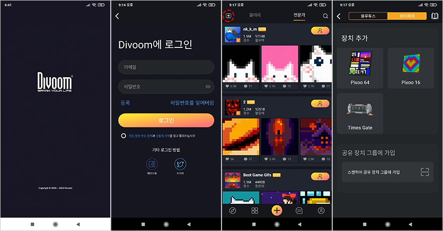 어플(App)까지 연동이 되면 이제 사용자가 자유롭게 5개의 LCD 화면을 원하는대로 지정해 놓을 수 있는데, 일단 어플을 통해서는 메인화면에 갤러리와 전문가 크게 2개의 카테고리로 분류해 이용자들이 직접 만든 픽셀 아트 작품 및 기능들을 한눈에 볼 수 있고, 선택해서 적용시킬 수 있습니다. 참고로, 갤러리 카테고리에선 검색설정을 추가로 할 수 있으며, 메인화면에서 아래에 있는 '+' 버튼을 누르면, 사용자가 직접 픽셀 아트를 만들 수 있는 애니메이션 프레임으로 들어갈 수 있습니다. 이 밖에도 아래에 나열된 버튼별로 들어가 보면, 맨 왼쪽에는 Times Gate를 기능적으로 사용할 수 있게 기능 모드를 적용할 수 있으며, 기기설정도 가능합니다. 그리고, 아래 버튼 왼쪽에서 2번째 버튼은 5개의 LCD 화면을 사용자가 쉽게 지정할 수 있게 해주는 기능으로 5개의 화면은 하나의 콘셉트로 전체 화면으로 보여주는 방식과 사용자가 직접 1개씩 지정할 수 있는 화면 방식, 그리고, 앞서 확인한 RGB 라이트닝 효과를 설정할 수 있습니다. 이 외에도 이용자들이 정보를 공유할 수 있는 커뮤니티 게시판 기능도 있으며, 사용자의 프로필정보 기능도 어플에 담고 있습니다.