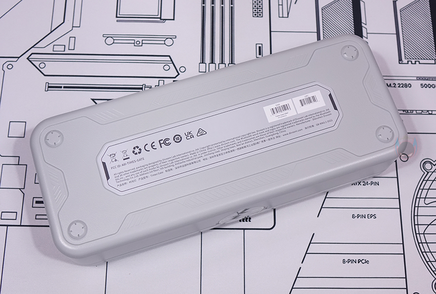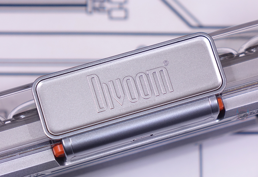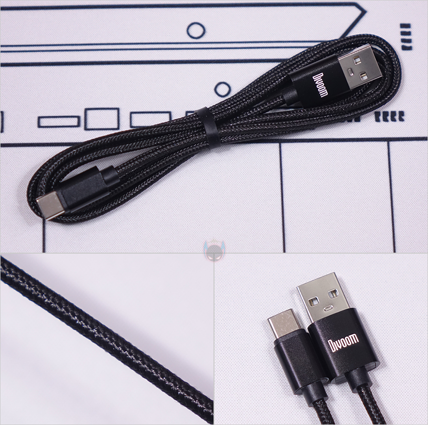 제품 밑바닥에는 상단과 비슷한 디자인으로 중앙에 Divoom 로고(Logo)를 새겨놨으며, 양쪽에는 게이트 디자인부분과 그대로 연결되면서 탁상 역할을 하는 받침대가 적용되어 있는데, 미끄럼방지를 위해 고무패드가 부착되어 있습니다. 그리고, 전원케이블로 제공되는 USB 케이블(Cable)은 총 1.2m 길이에 꼬임방지를 위한 전체 슬리빙처리와 USB Type-A to C 인터페이스를 갖추고 있습니다.