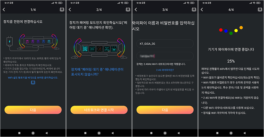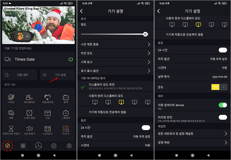 방금 언급했듯이, Times Gate는 어플(App)을 통해 5개의 LCD 화면을 사용자가 원하는대로 적용할 수 있습니다. 물론, 그전에 어플을 통해서 Times Gate와 연동을 해야 하는데, 먼저 어플을 설치한 후에 회원가입은 필수입니다. 회원가입을 해야 어플 기능들을 사용할 수 있기 때문입니다. 회원 가입을 한 후, 장치 추가를 통해 Times Gate와 연결을 시켜주면 되는데, Times Gate는 와이파이(Wi-Fi) 방식으로 연결되며, 2.4GHz 규격을 지원합니다. 그리고, 연결 전에 전원(Power) 버튼을 8초 이상 누르고 있으면 페어링모드가 시작됩니다. 페어링모드까지 시작이 되면, 연결 안내에 따라 진행하면 초보자도 어렵지 않게 어플(App)과 연동을 마칠 수 있습니다. 참고로, 처음 연결 시 펌웨어 업데이트도 자동으로 감지해서 최신 버전이 있으면 자동으로 업데이트 진행을 합니다.