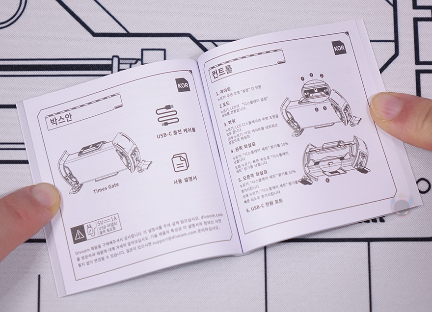 Divoom Times Gate의 제품 박스이자 전용 보관박스부터 살펴보면, 플라스틱 재질에 그레이 색상을 가지고 있으며, 가운데는 Times Gate 문구와 함께 중앙에는 마크 같은 디자인으로 Divoom 로고를 새겨놨는데, 투명 보호캡처럼 커버도 적용되어 있습니다. 그리고, 개봉시에는 이 커버 부분에 보호비닐도 부착되어 있죠. 그리고, 박스를 여는 개봉 부분에도 씰(seal)이 부착되어 있으며, 박스를 열어보면 본 제품인 Times Gate가 제품 크기에 맞춘 틀에 포장된 것을 확인할 수 있으며, 아래에 케이블이 들어있는 별도의 박스와 아래공간에 제품 설명서가 담긴 것을 확인할 수 있습니다. 그래서, 제품 구성은 Times Gate, USB 전원케이블(Power cable), 제품설명서(Manual)로 이루어져 있죠. 참고로, 제품설명서에는 한국어(Korean)도 포함되어 있습니다.