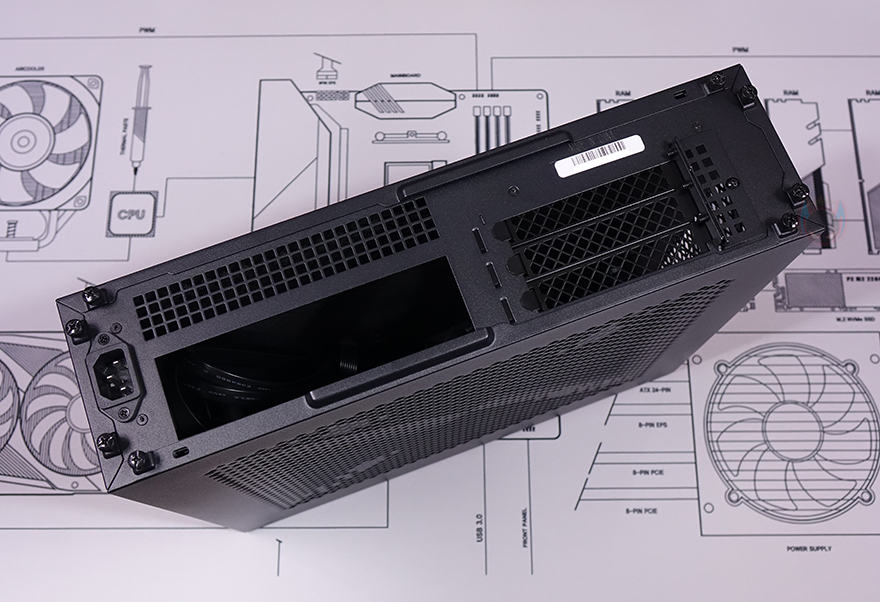 케이스 후면에는 이미 실버스톤의 슬림형 ITX PC케이스를 접해본 소비자라면 후면만 봐도 내부 구조를 대략 짐작할 수 있는데, 한쪽은 메인보드, 나머지 한쪽은 그래픽카드가 장착되는 구조입니다. 그래픽카드가 장착되는 부분에는 PCI 슬롯 3개를 갖추고 있어서 3단 높이의 그래픽카드까지 장착이 가능하도록 지원하는데, 참고로 스펙상으로 62mm 높이까지 지원합니다. 그리고, 메인보드 공간쪽에는 바깥쪽 끝부분에 전원케이블과 연결되는 포트가 적용되어 있으며, 방금 확인했던 사이드 패널과 양쪽 패널이 모두 손나사(Hand-screw)로 고정된 것을 확인할 수 있습니다.
