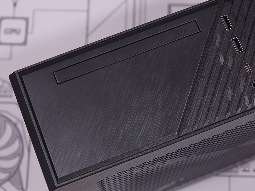 그럼, 본격적으로 실버스톤(Silverstone)의 MILO 12 ITX PC케이스를 살펴보는데, 일단 색상은 블랙색상 1가지로 출시되었으며, 크기는 앞서 사양표기에서 확인했듯이 105(W)x393(H)x378(D)mm를 가졌습니다. 한눈에 봐도 슬림하기 때문에 ITX기반 PC케이스라는 걸 알 수 있고, MILO 시리즈(Series) 특유의 심플한 디자인도 나름 유지하고 있습니다. 전면 베젤을 살펴보면, 실버스톤은 슬림형 ITX PC케이스에 슬림(Slim) ODD 지원을 항상 갖추고 나오는데, 이번 MILO 12 모델 역시 전면 한쪽에 금속느낌의 헤어라인 디자인과 함께 슬림 ODD 커버가 적용된 것을 확인할 수 있습니다. 그리고, 중앙에는 사선 디자인과 함께 USB 3.0 Type-A 포트 2개와 Type-C 포트 1개, EAR/MIC 포트가 배치되어 있으며, 나머지 전면 한쪽에는 메시(Mesh) 디자인과 함께 끝부분에 전원 버튼(Power button)과 리셋 버튼(Reset button), 그리고 작동상태를 확인할 수 있는 LED 램프가 배치되어 있죠. 전면 베젤에서만 3가지 디자인이 적용되었다라는 걸 알 수 있습니다.