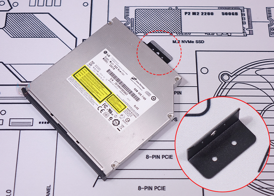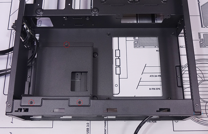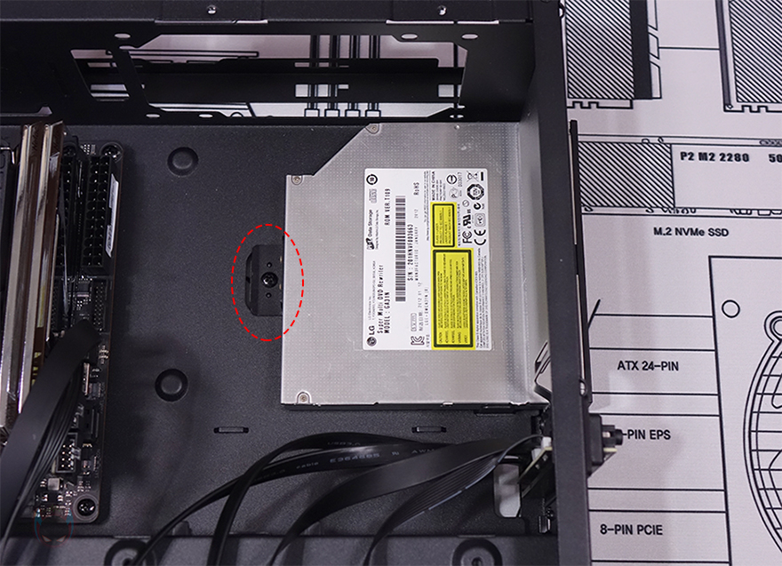 패널과 베젤까지 분리한 상태에서 MILO 12 내부를 살펴보면, 일단 전면 베젤은 분리한 후 전면 내부를 보면 한쪽 그러니깐 그래픽카드가 장착되는 공간 전면 내부에는 80mm 팬을 장착할 수 있게 지원하고 있습니다. 그래서, 앞서 전면 베젤 한쪽에 메쉬(Mesh) 디자인이 왜 적용되었는지를 알 수 있죠. 그리고, 전면 반대쪽 그러니깐 메인보드가 장착되는 공간의 전면 내부에는 2.5인치 SSD/HDD 저장장치(Storage)를 장착할 수 있게 가이드가 장착되어 있으며, 바로 아래에는 앞서 언급한 슬림 ODD를 장착할 수 있는 공간이 마련되어 있습니다. 가이드 장착 역시 손-나사(Hand-screw)가 사용되었기 때문에 쉽게 분리가 가능하고, 분리해서 2.5인치 SSD/HDD를 제공되는 나사를 사용해 장착해 주면 됩니다.
