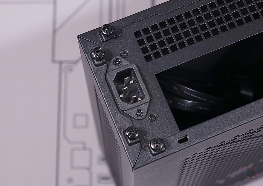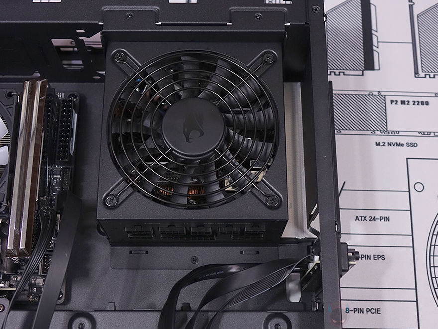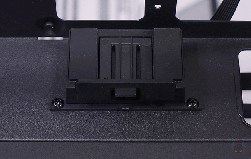 또한, 그래픽카드가 장착되는 공간 후면에는 추가 쿨링시스템을 갖출 수 있게 140mm 팬을 장착할 수 있는 나사홀이 처리되어 있으며, 그 옆으로 2.5인치 SSD/HDD를 2개 장착할 수 있는 가이드가 장착되어 있습니다. 그러니깐 전면 80mm 팬에 이어서 바로 내부 뒷쪽에 140mm 팬까지 적용해 그래픽카드 쿨링효과를 높일 수 있도록 한 거죠. 그리고, 바로 공간에는 메인보드가 장착되는 공간으로 앞쪽에는 파워서플라이(PSU)가 장착되는데, 역시 가이드에 장착하는 방식으로 나사를 풀면 파워서플라이 가이드를 쉽게 분리할 수 있습니다. 파워서플라이 가이드에는 최대 160mm 폭까지 장착할 수 있게 지원하고 있어서 SFX 규격은 물론, SFX-L 또는 깊이(Depth)가 작은 ATX 규격도 장착이 가능합니다. 그리고, 그대로 아래쪽 공간 그러니깐 측면 내부 공간에는 파워서플라이와 연결되는 연장 케이블과 함께 추가로 2.5인치 SSD/HDD를 장착할 수 있는 가이드를 또 확인할 수 있어서, MILO 12에 총 장착되는 2.5인치 SSD/HDD는 4개까지 가능하다는 걸 알 수 있죠.