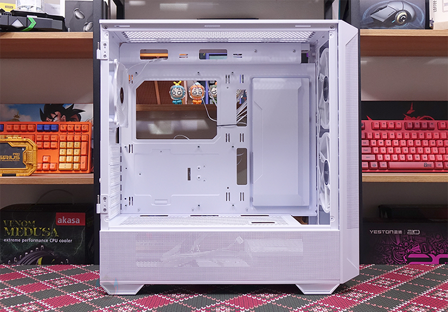 메인보드 후면 공간은 약 24mm 공간을 가지고 있어서 케이블정리를 하는데 큰 어려움은 없으며, 조립 시 한 가지 알아둬야 할 점이라면 측면 커버를 사용할 때 2.5인치 HDD/SSD를 미리 장착해야 하고, 이를 연결하는 SATA 케이블과 파워서플라이 케이블도 미리 저장장치에 연결하고 커버를 장착해야 합니다. 조립 마무리로 전면 160mm 팬 2개와 후면 120mm 팬 1개를 허브에 연결하고 메인보드 ARGB 헤더에 연결한 후, 전원을 켜면 연동되는 RGB 효과를 볼 수 있습니다. 물론, 케이스 상단에 LED 모드 버튼이 있기 때문에 모드 버튼을 통해서도 팬의 다양한 RGB 모드 효과를 볼 수 있죠.