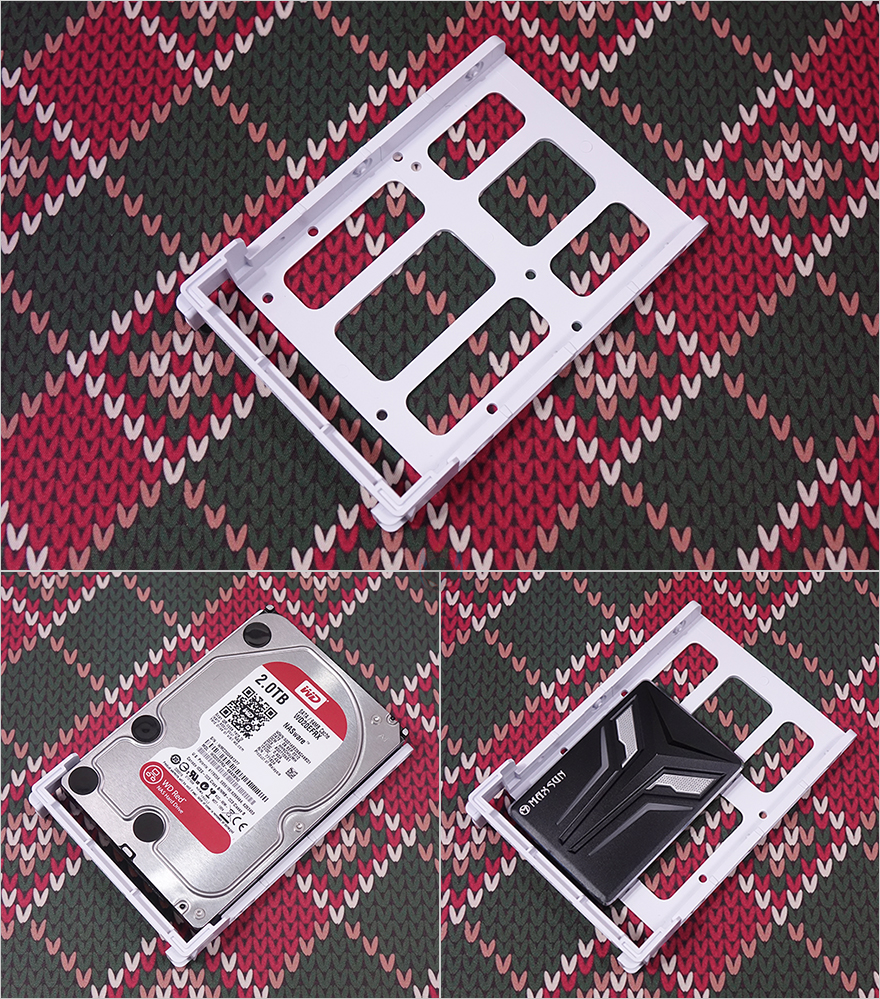 그리고, 후면에서 내부 하단 공간을 확인해보면, 파워서플라이가 장착되는 자리에는 기본적으로 샤시 자체의 받침대 부분 외에도 진동소음을 줄이도록 패드를 부착해 놨으며, 앞부분 공간에는 HDD베이가 장착되어 있는데, 앞서 언급했듯이 분리가 가능해 위치이동이 가능합니다. 그리고, HDD베이는 1개의 HDD 가이드가 장착되어 있으며, 기본적으로 무나사 방식으로 HDD를 장착할 수 있는 가이드이며, 추가로 나사를 사용할 수도 있습니다. 물론, 2.5인치 HDD/SSD 장착도 가능하죠. 그리고, HDD베이 상단에도 3.5인치 HDD나 2.5인치 HDD/SSD를 장착할 수 있습니다. 끝으로, NX416L PC케이스의 화이트 색상모델 같은 경우에는 허브 장치를 제외하고 앞서 확인한 케이스 버튼과 포트 등의 패널 케이블과 기본 장착된 팬들의 케이블도 모두 화이트 색상으로 통일시켜 놨습니다.