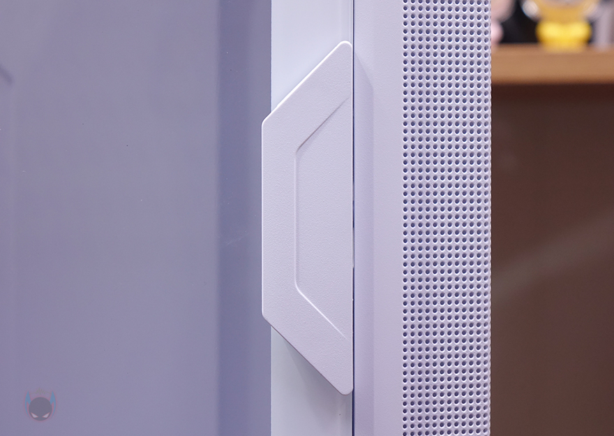 NX416L PC케이스의 사이드 패널은 전면시 왼쪽 패널은 강화유리가 적용되어 있는데, 도어 방식으로 앞부분에 손잡이 디자인이 적용되어 있으며, 안쪽에는 자석방식으로 고정되도록 위아래 각각 자석이 적용되어 있죠. 또한, 힌지 방식으로 패널 분리가 가능하고, 강화유리 영역이 아닌 나머지 아랫부분은 내부 하단 공간의 쿨링효과를 위해 전면처럼 메쉬 디자인을 적용하고 있죠. 참고로 강화유리 두께는 4mm입니다. 그리고, 반대편인 오른쪽 패널은 일반 민무늬 형태에 앞부분에 내부 측면 쿨링효과를 위해 역시 에어홀 처리가 되어 있는데, 패널은 분리해서 안쪽을 보면 자석방식의 먼지 필터도 기본 장착된 것을 확인할 수 있습니다.