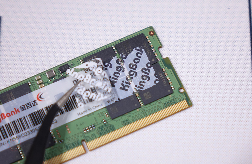 그럼, KingBank SO-DIMM DDR5 메모리를 살펴보면, 노트북/미니PC에 사용되는 제품이기 때문에 데스크톱 PC메모리처럼 방열판 같은 부착은 없습니다. 쉽게 말해, 메모리의 가장 기본형태를 가지고 있죠. PCB 기판도 가장 기본이 되는 녹색색상입니다. 그리고, 한쪽 면에만 메모리 모듈이 적용된 단면 메모리 형태이고, 라벨 부분에는 클럭과 용량 표기를 확인할 수 있죠. 참고로, 라벨 스티커를 흔적이 남는 씰링 스티커이며, 스티커를 제거하면, 메모리 모듈 외에 DDR5에서부터 적용되는 HBM 기술에 따른 PMIC칩이 중앙에 적용된 것을 확인할 수 있습니다.