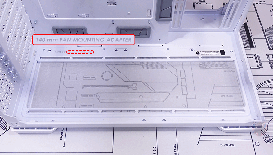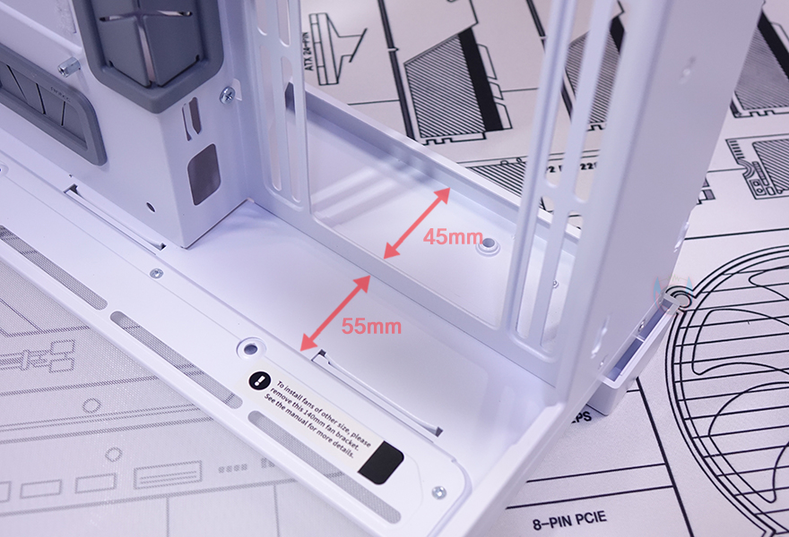 내부 하단 같은경우 쿨링시스템으로 역시 상단과 마찬가지로 160mm 팬, 140mm 팬, 120mm 팬 모두 장착이 가능한데, 다만 120mm 팬을 장착할 때는 앞서 구성품에서 확인한 120mm 팬 브라켓으로 교체해야 합니다. 그러니깐 케이스에 기본 장착된 브라켓은 140mm 팬 브라켓이라는거죠. 브라켓은 4개의 고정나사를 풀면 쉽게 분리가 가능하고, 팬 장착 지원은 상단과 동일하게 140/120mm 팬은 최대 3개, 160mm 팬은 최대 2개까지 장착이 가능합니다. 그리고, 수랭쿨러시 라디에이터는 상단/측면과 마찬가지로 최대 360mm까지 장착할 수 있죠. 참고로, 내부 하단 공간 높이는 최대 135mm까지 지원합니다.